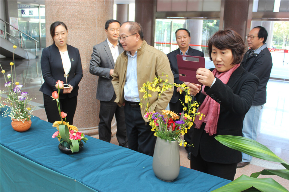 园林与林学院学生为刘春霞讲解插花艺术的创作技巧与设计手法。刘春霞指出,学院应重点支持此类最具专业特色、锻炼专业技能的实践类活动,培养动手能力的同时还可陶冶情操,培养审美能力。