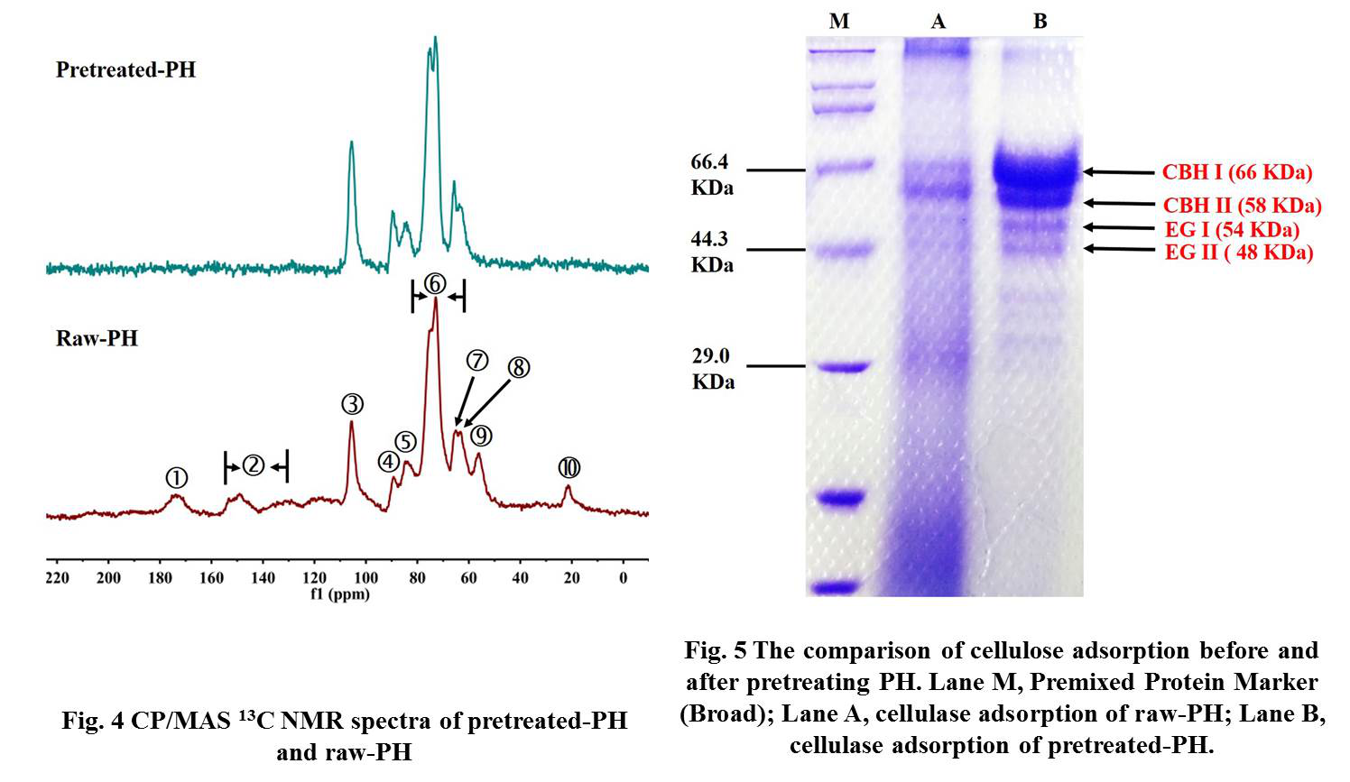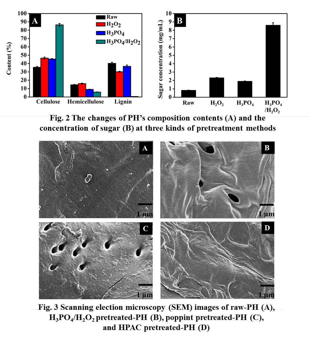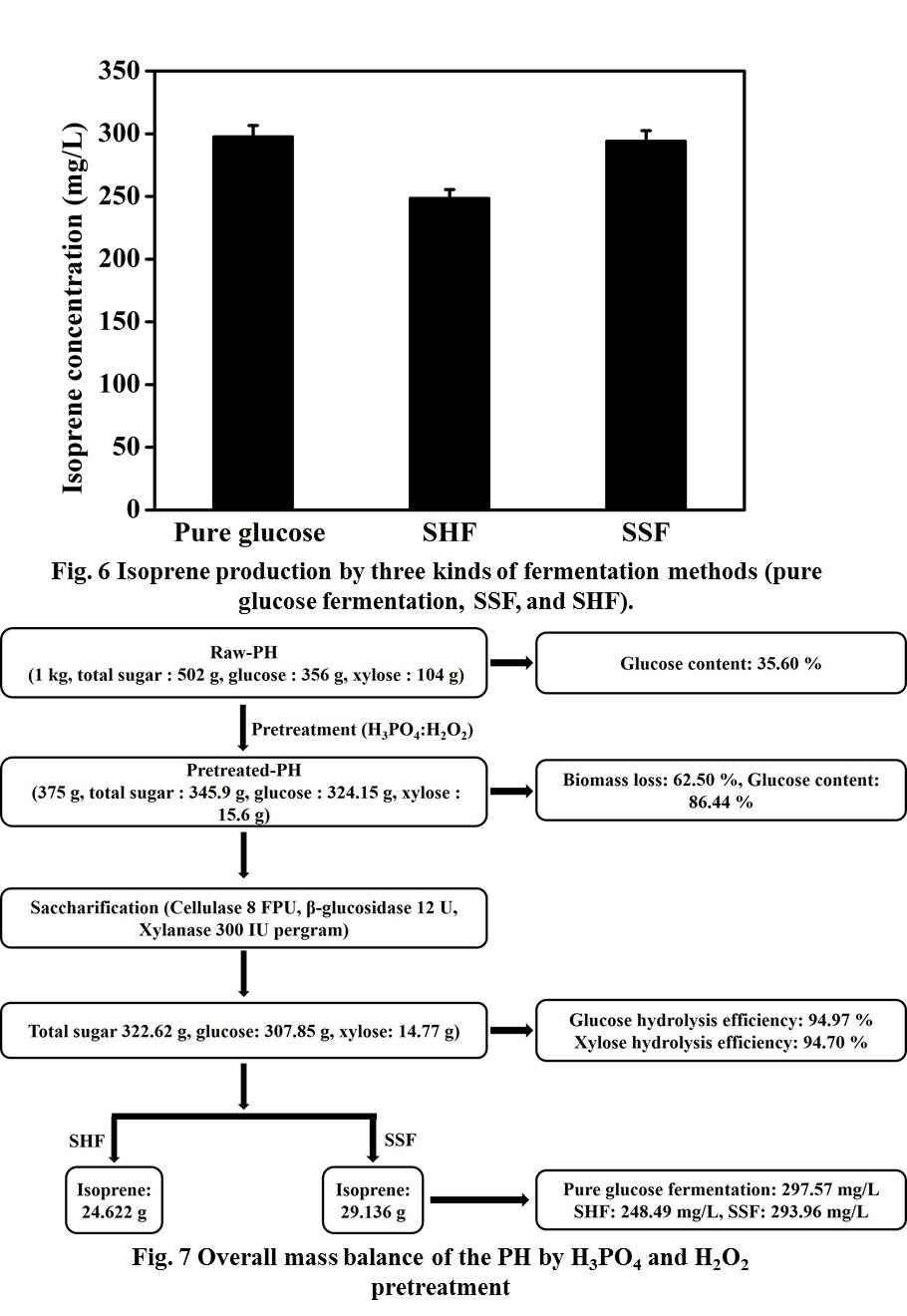 杨建明教授研究团队经过研究探索出一种高效破坏木质纤维素分子结构的预处理方法(磷酸和过氧化氢组合法)。该方法与传统物理化学预处理方法相比具有高效、低成本、能耗低等特点。利用该预处理方法对木质纤维素(花生壳)进行预处理,可成功去除木质纤维素材料中约98%的木质素,85%的半纤维素,使得木质纤维素固体残渣的酶解糖效率高达95%;获得的糖水解液无需进行脱毒处理即可进行同步糖化发酵()。微生物利用上述方法获得的糖进行发酵产生的目标产物(异戊二烯)的产量达到纯葡萄糖发酵的98.8%。该研究成果将为木质纤维素的资源化利用提供更为简便高效的工艺技术路线。