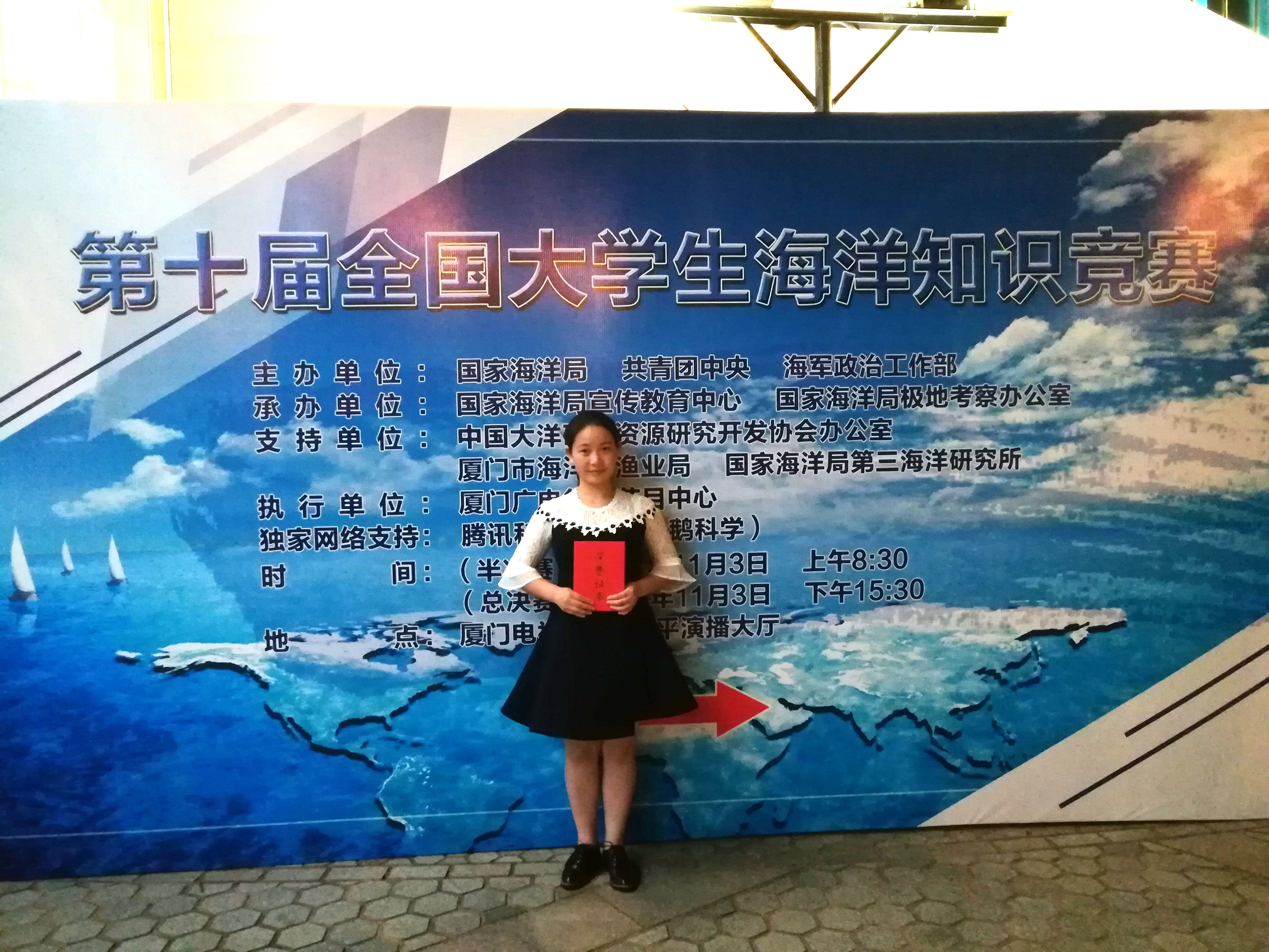 本次比赛采取个人参赛、学校参赛、地方参赛、海军院校参赛四种方式,最终来自中国海洋大学、同济大学、厦门大学、青岛农业大学等30余所高校的60名学子从万余名参赛选手中脱颖而出,齐聚风景秀丽的新城厦门。11月2日,各位选手们经过第一环节的复赛笔试,已经信心倍满,期待正式比赛的到来。在半决赛中,第一次参加比赛的吴亚新并没有紧张而且更加沉稳的答题。经过“快答60秒”、“绝地反击”、“过关斩将”、“乘胜追击”等环节的比拼,60名选手中的10名选手最终进入总决赛。总决赛中,10名选手每人拥有100基础分,通过“快答60秒”、“险中求胜”、“抢占先机”三个环节的依次作答,所获成绩进行累积排行,最高的五位进行“巅峰对决”,最终决出大赛的南极奖、北极奖和大洋奖。现场题目的设置涉及海洋知识的方方面面,不仅注重考查学生知识面的广度,同时侧重深入问题内部探究的考察,提高了对知识的了解程度。吴亚新现场状态良好,在快答环节沉着冷静,凭借日常知识的积累,勇夺三等奖,展现了青岛农大学子的良好风采。
