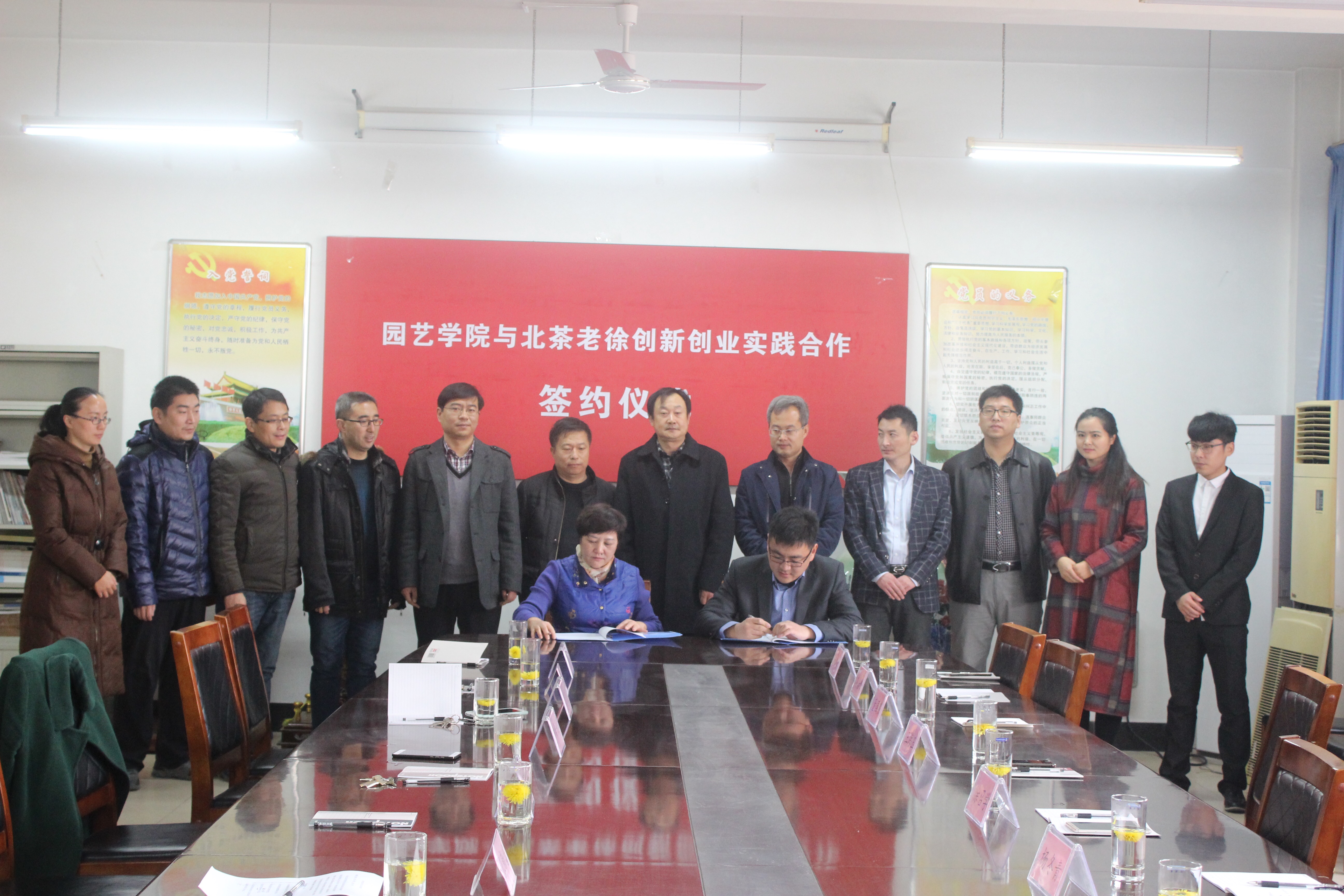 12月14日,青岛农业大学园艺学院在会议室与北茶老徐公司举行“创新创业实践合作”签约仪式,旨在为学生提供一个创新创业的平台。北茶老徐茶业有限公司总经理徐召学,华盛绿能公司王海玉,青岛果茶花会站长董国强,园艺学院分党委书记刘培利,院长王然,党委副书记王春晓,茶学专业负责人张新富老师、茶学教研室主任胡建辉老师等出席本次签约仪式,仪式由园艺学院分团委书记刘燕杰主持。