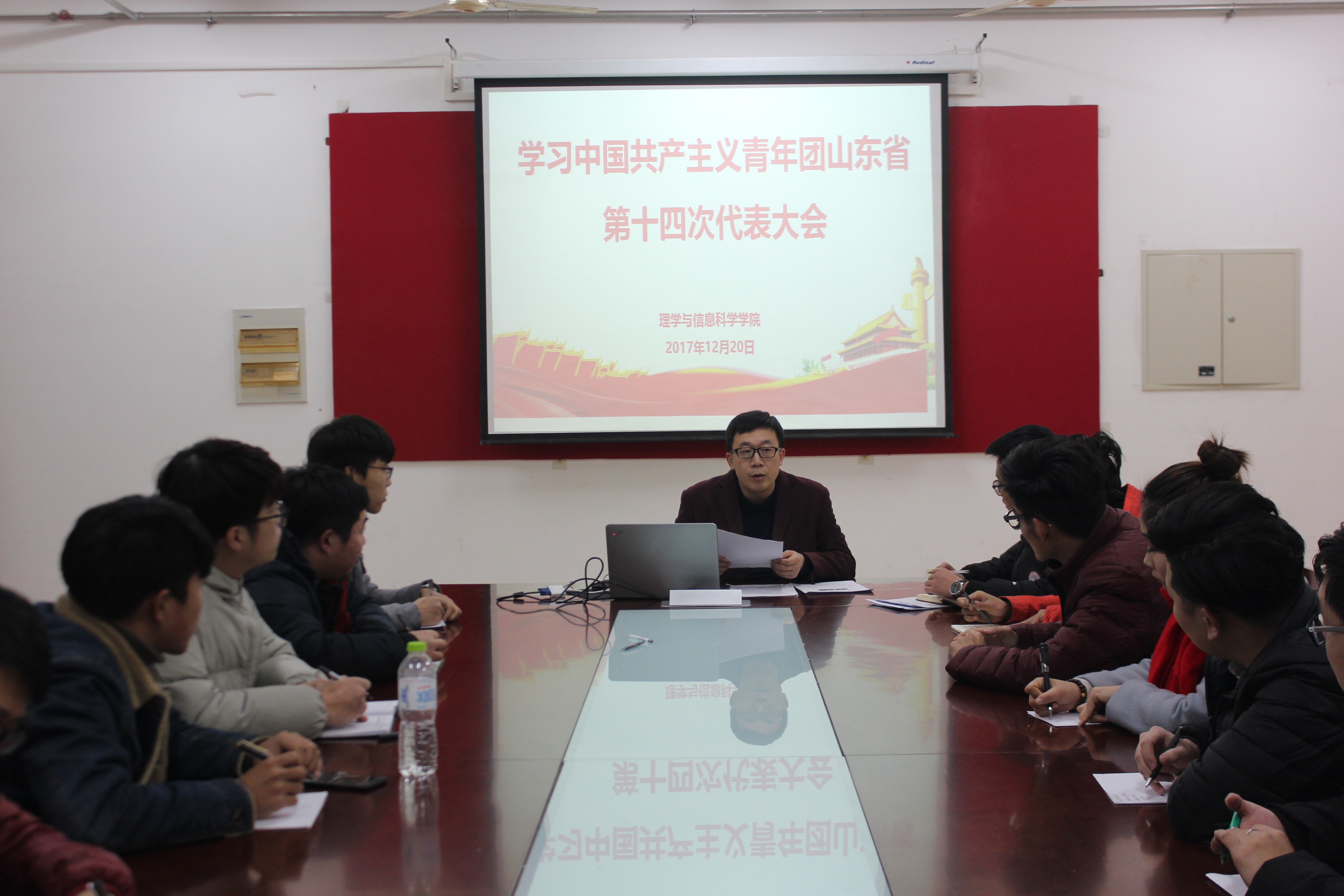 12月20日晚,青岛农业大学理学与信息科学学院在信息楼215组织学习中国共产主义青年团山东省第十四次代表大会,本次会议由理信学院团委书记孙杰主持,理信学院主要学生干部参加。