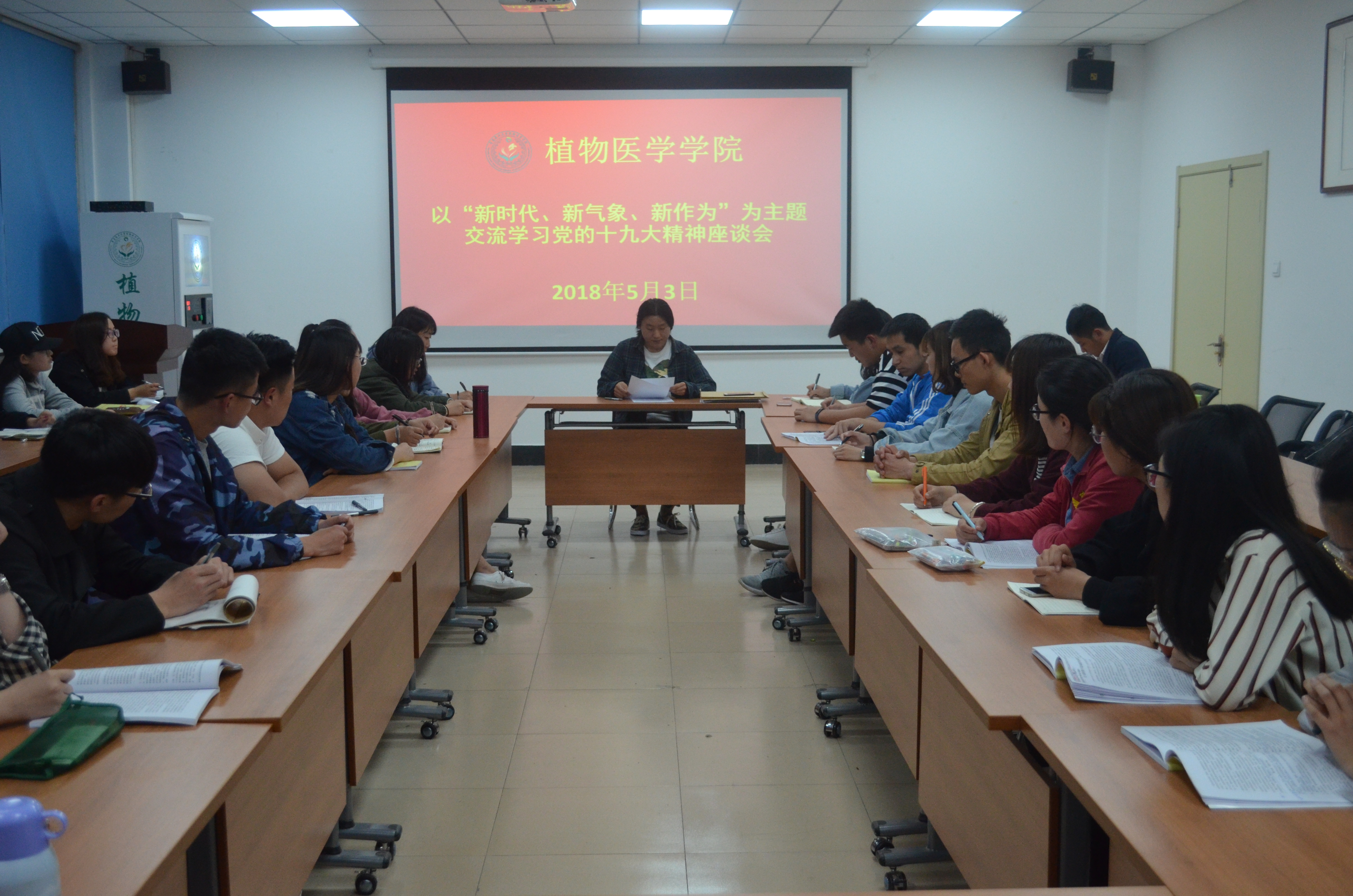为组织引导广大青年深入学习宣传贯彻党的十九大精神,深刻领会习近平新时代中国特色社会主义思想,5月3日,植物医学学院在生物楼会议室开展以“新时代、新气象、新作为”为主题的党的十九大精神学习交流座谈会,学院兼职团委副书记林晓出席并主持本次活动,学院各班团员代表积极参与。
