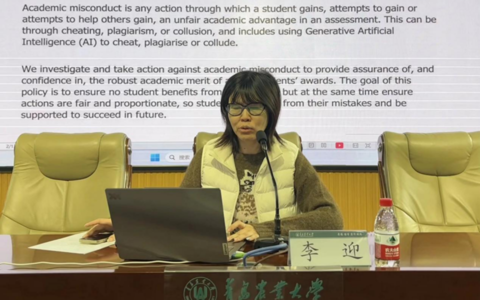 李迎围绕英国皇家农业大学学术不端政策开展专题培训,通过典型案例分析,系统讲解学术规范的重要性,提醒全体学生干部严守学术底线,树立诚信意识,营造风清气正的学术环境。