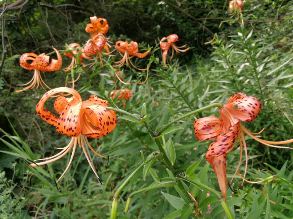 继续前行的同学们在远离道路的地方发现了十余株山东卷丹的存在,但令队员们难过的是卷丹的生长地区有很严重的被破坏情况。多株卷丹被整株连根拔起,疑似人为破坏。卷丹具有极高的观赏价值与药用价值,我国野生卷丹虽然分布较广但是资源量不大,且因为人为森林破坏等原因野生卷丹与其他珍贵野生植物一样都有向高海拔地区退缩的现象,在低海拔地区已经很少能看见野生卷丹的分布。卷丹的分布多在400-1000米海拔区间,此次在海拔370米处发现卷丹在一定程度上说明了桃花峪地区自然资源保护情况较为良好。但还是希望当地加强对环境的保护,尽量减少类似情况的发生。