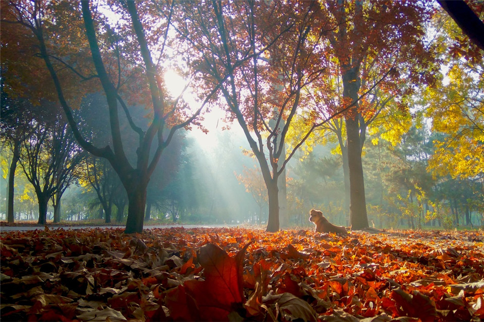 静谧的早晨,阳光透过树隙间,洒向铺满落叶的大地,洋洋洒洒,温暖着每个角落。