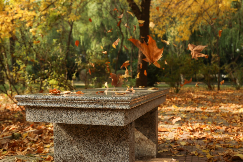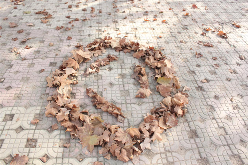 初冬降临,树叶随风飘落,映过初冬的暖阳,翩然散落在地,似苯环、似笑脸、点缀出化学的美。