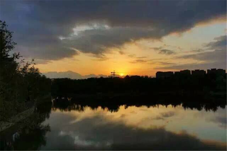 夕阳渐落,湖边的柳树接连而成,与远山交相呼应,一轮红日映照着青农,遗留秋的暖意。