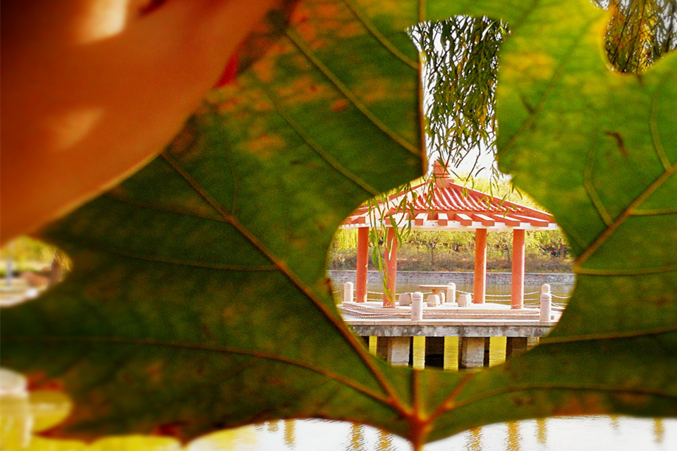掬起一片落叶,小心绘出烧瓶的形状,透过烧瓶观赏着伫立在虹子湖上方的怡心亭,折服于这岁月静好的美景,勾勒出化学的形态。