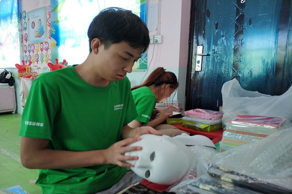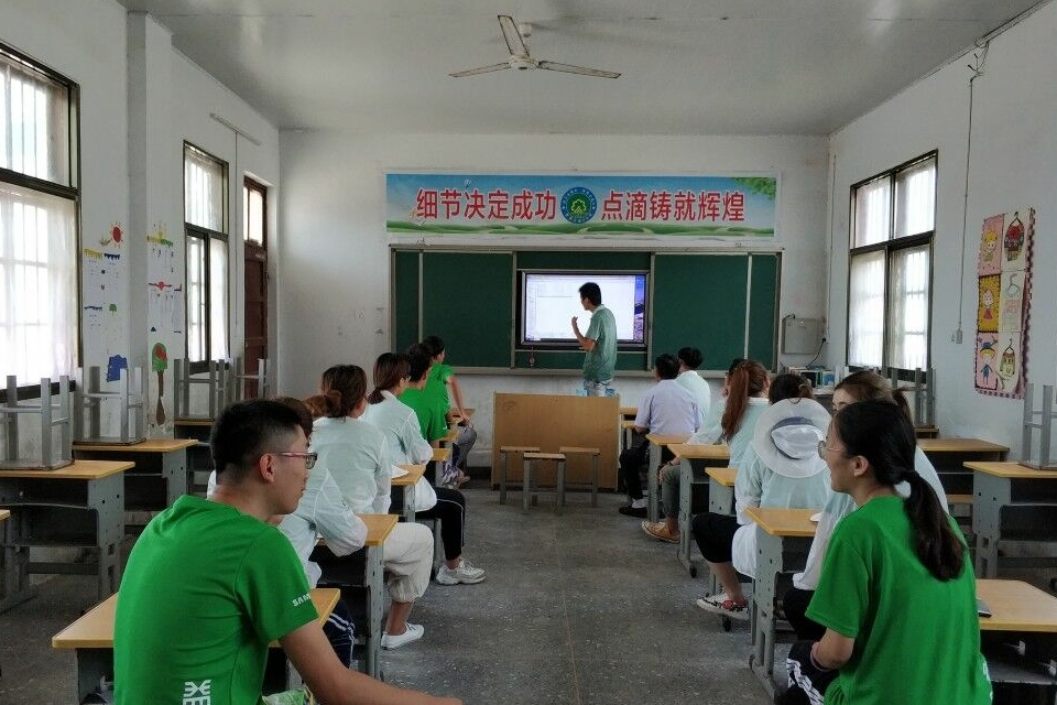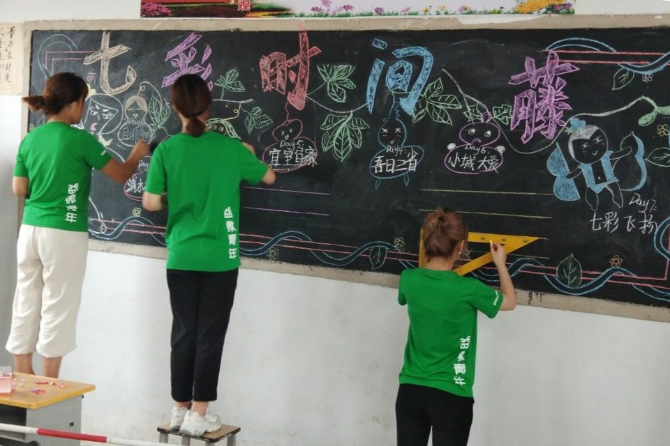 烈日当空,骄阳似火,地面上的景物好像融化了般。午饭过后,实践队队员们便投入了忙碌的准备工作当中。“可是我不会画画。”“怎么办我也不会!”“哎呀,没事,比着葫芦画瓢还不会吗!”实践队队员们在对自己半信半疑中完成了黑板报,“感觉来到这儿自己什么都可以完成”,苹果大汗淋漓的说着。“哈哈,看老卓,老卓已经与这里融为一体了”,大家看着老卓熟练的拆洗着空调,毫无违和感。一下午的忙忙碌碌,队员们早已满头大汗、衣襟湿透,但大家依然乐在其中。