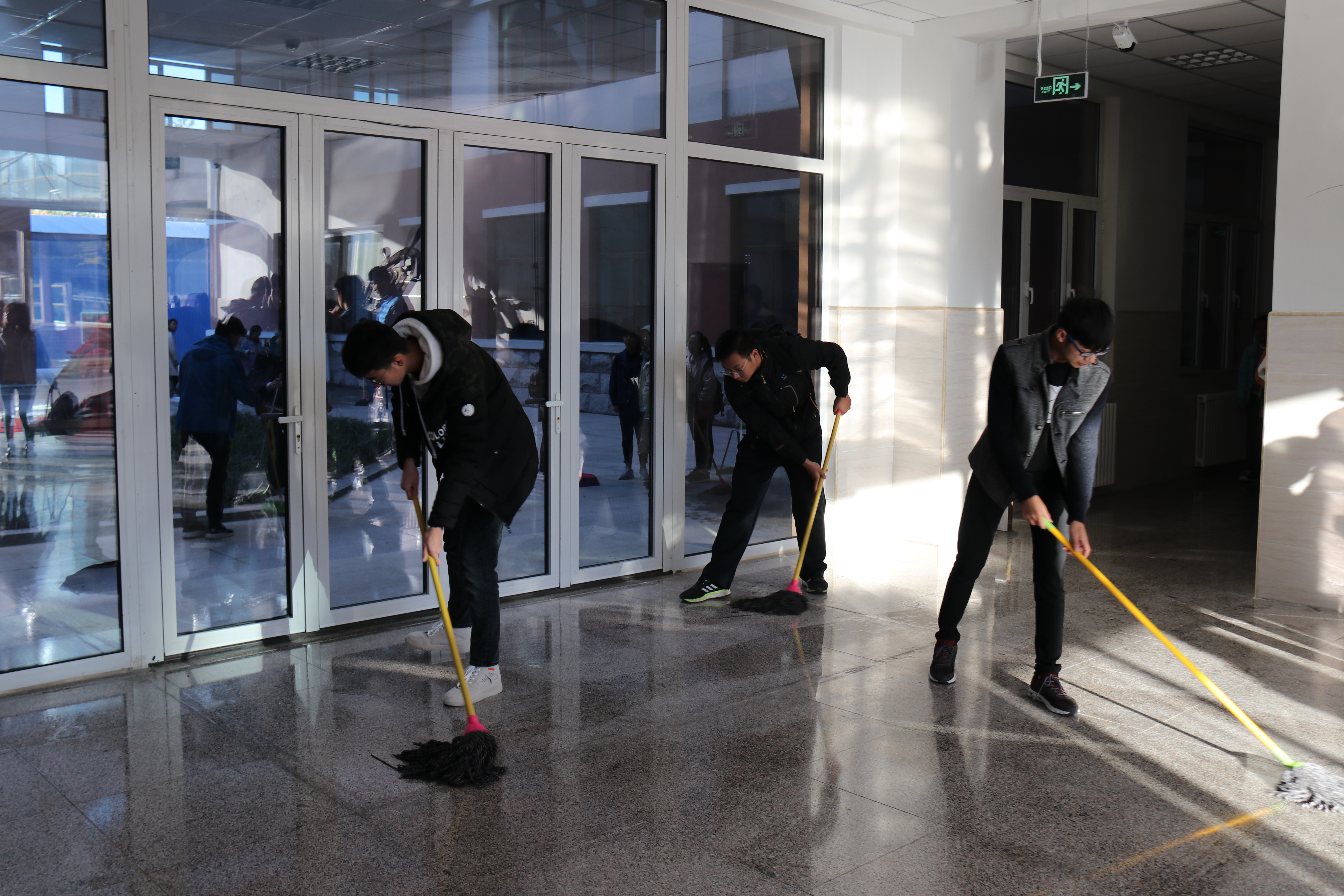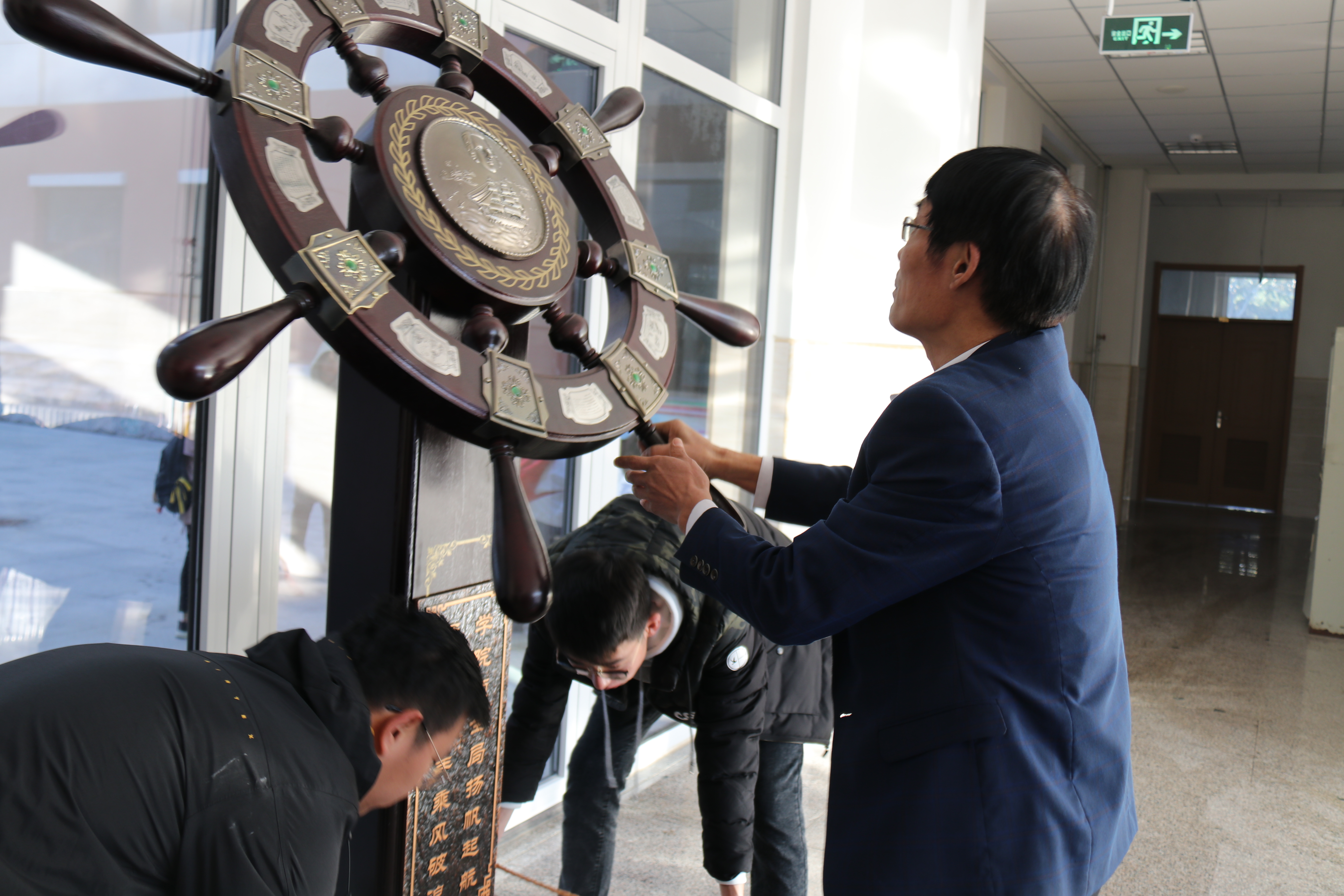 迎接突击队的第一项任务是"装点"食品楼。他们以班级为单位,分管楼内不同区域,学生们或手持抹布,或拿着扫帚,认真地清理自己的分管区域。经过同学们的辛勤劳动,楼内地面整洁光亮,窗台门框焕然一新。在食品楼一楼大厅,党委书记何忠诚带领学生擦拭“师生舵”并将其摆放至中央。随后向在场学生介绍师生舵的来源与学院的发展历史。何忠诚说道:“师生舵是学院成立以来体形最大、做工最精美、最具代表性的一柄舵,在无形之中为学院建设提供了源源不断的灵感来源和精神力量。”