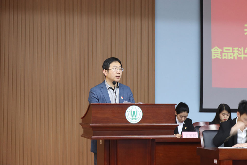 何忠诚代表学院党委讲话,他指出学院团委在学院党委和校团委的正确领导下,始终坚持以习近平新时代中国特色社会主义思想为指导,深入学习宣传贯彻党的十九大精神,并在团员思想引领、素质拓展、权益服务和组织提升等方面均取得了突出成绩:学院连续八年被评为学校共青团工作先进集体,连续五年被评为学校暑期社会实践活动优秀组织单位等诸多荣誉称号。此外,学院团员青年在科技创新、社会实践、志愿服务等方面更是捷报频传,先后获第九届全国“创青春”创业计划大赛银奖,山东省创业计划大赛金奖等省部级以上奖励22项,2017年获全国“镜头中的三下乡”优秀摄影奖一项等等荣誉奖项。何忠诚代表学院党委向食品学院共青团工作和全体团员青年提以下三点希望和要求,一要拥抱新时代,宣传新思想;二要立足新起点,展现新作为;三要担当新使命,谱写新篇章。