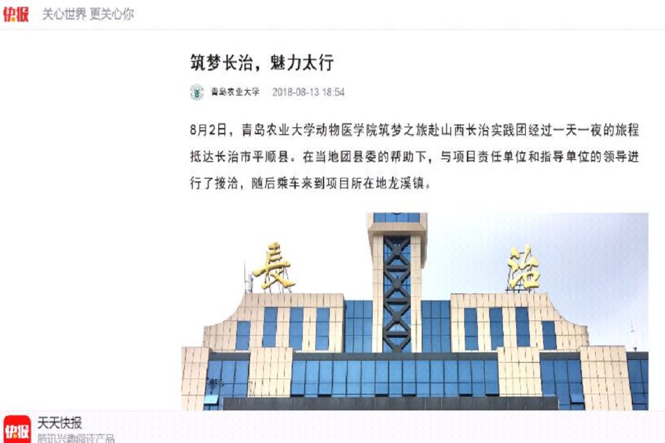 8月2日,青岛农业大学动物医学院筑梦之旅赴山西长治实践团经过一天一夜的旅程抵达长治市平顺县。在当地团县委的帮助下,与项目责任单位和指导单位的领导进行了接洽,随后乘车来到项目所在地龙溪镇。