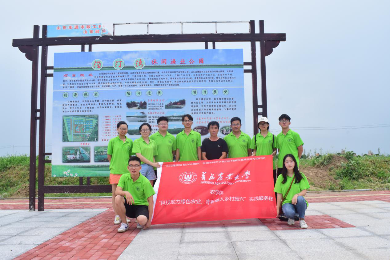 实践服务团全体队员、渔汀湾休闲渔业公园工作人员于展牌前合影留念。(中国青年网通讯员 王冠颖摄)