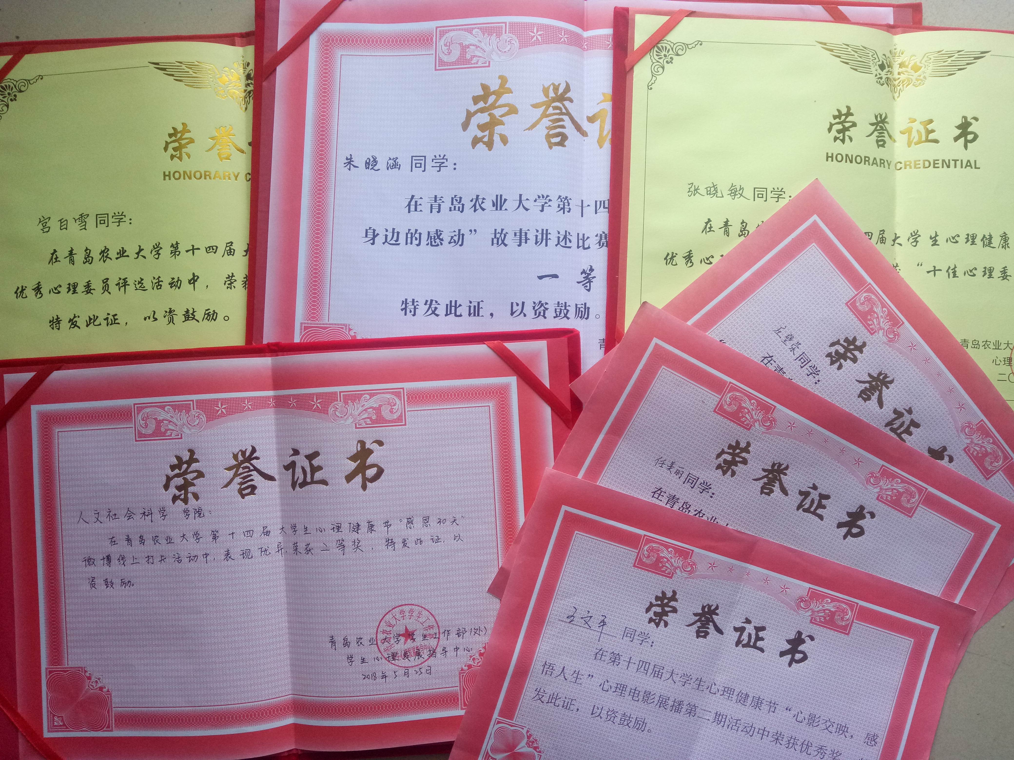 学院高度重视心理健康节的组织,引导广大同学积极参与各项校级活动并取得优异成绩:在“感恩30天”微博线上打卡活动中荣获集体二等奖;朱晓涵同学在“拥抱身边的感动”故事讲述比赛中荣获一等奖;在“成长·相伴”优秀心理委员评选比赛中,王文平同学在“心影交映,感悟人生”心理电影展第二期活动中荣获个人优秀奖;在 “爱生活,越幸福”幸福感提升训练营活动中,蒙冠妙、任美丽、朱英豪、卢晓珊、庄璧荥五位同学荣获优秀个人奖。