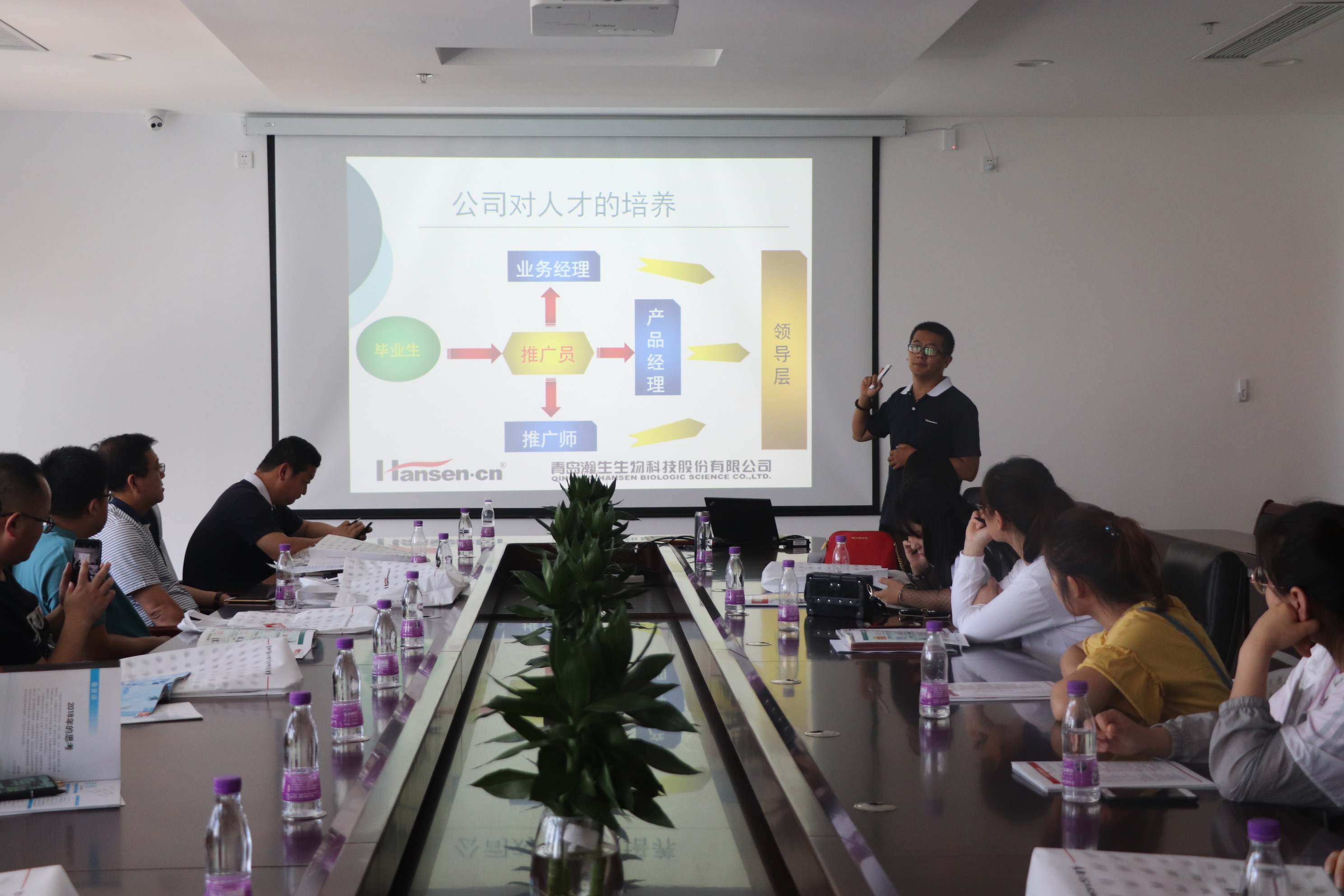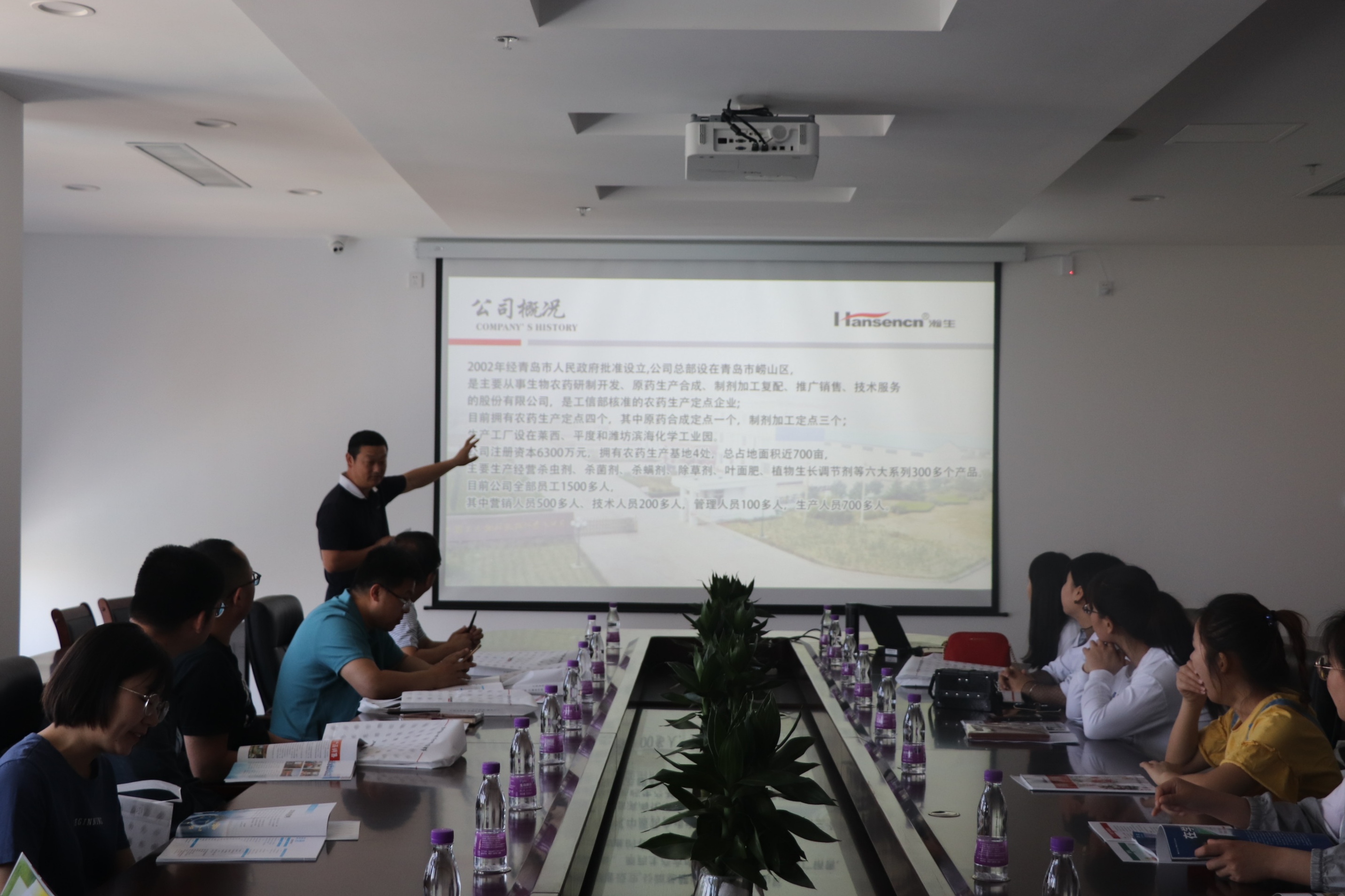 青岛瀚生谷成金作物科学有限公司总经理、植物保护专业2001级校友赵红波从企业宗旨、企业理念、企业文化以及主要营销产品四个方面出发,向植物医学学院师生一行做出详细介绍。他指出,瀚生公司以“提高作物品质,促进生命健康”为己任,走绿色农业发展之路,重点开发高效低毒、环境友好的农药产品,着力打造安全环保的绿色农化产业的企业宗旨;公司坚持诚信、合作、学习、创新的核心理念,围绕勤奋努力、勇于创新、锲而不舍等公司文化,努力营造积极向上的工作氛围。他还向同学们重点介绍了瀚生公司拥有的现代化农药生产基地、农药制剂生产装置、农药原药生产装置等,介绍了公司的六大系列主要产品。