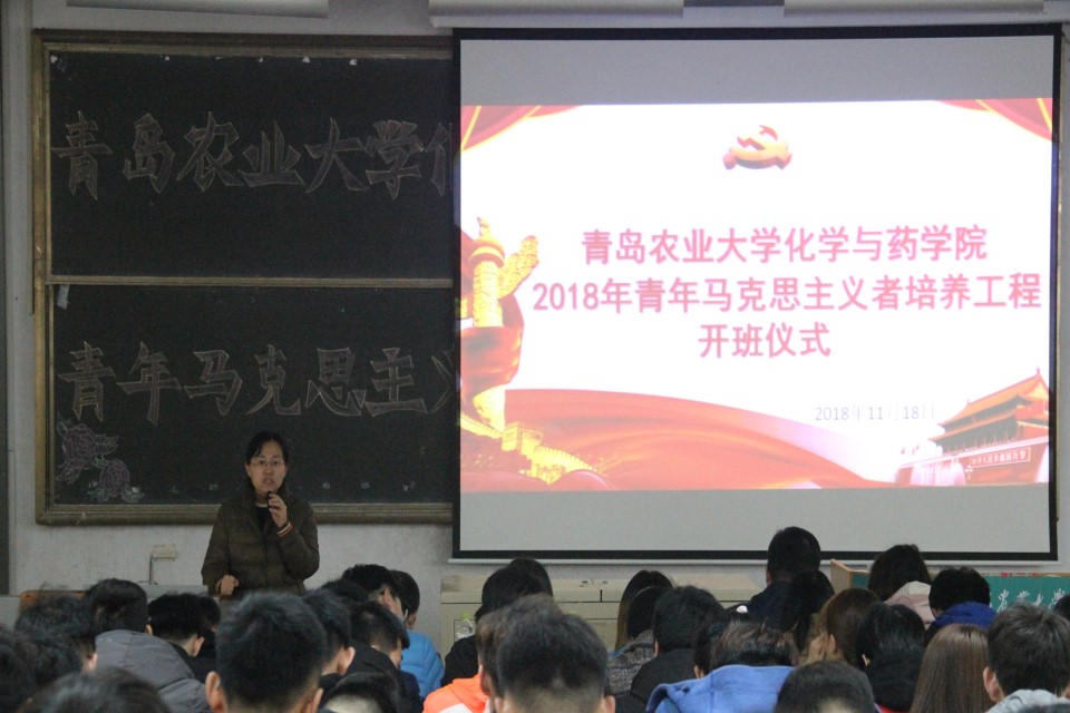 11月18日,青岛农业大学化学与药学院于教学区召开2018年青年马克思主义者培养工程开班仪式。院党委副书记史雪辉,正科级辅导员杨冬冬,辅导员辛鑫,兼职辅导员王鹏出席会议,院2018级青马工程学员参加会议。会议由团委书记王海霞主持召开。