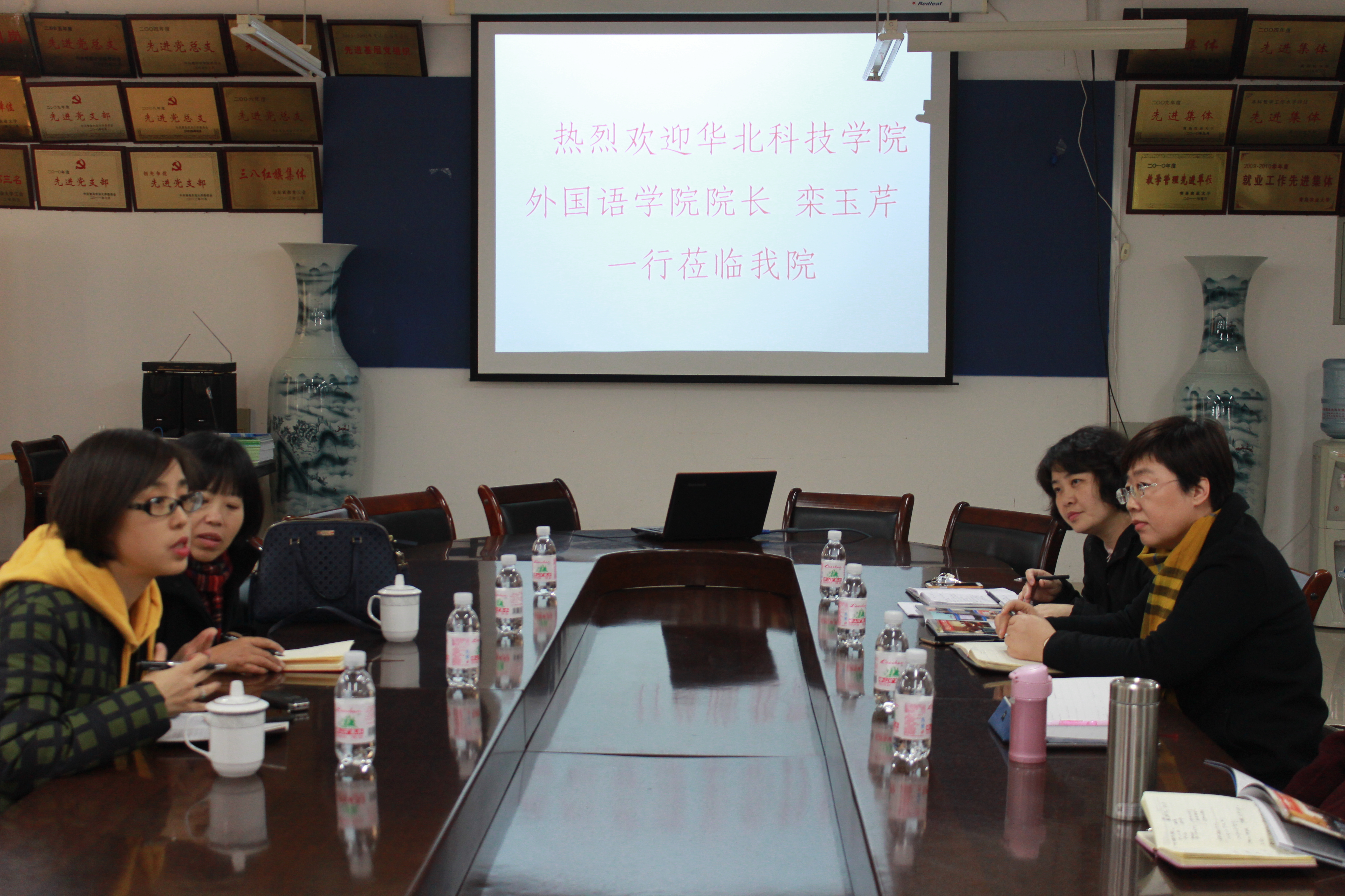 11月29日下午,华北科技学院外国语学院院长栾玉芹一行到外国语学院走访交流。副院长纪卫宁、李春梅、各专业负责人等在学院会议室与来访客人进行了座谈交流。