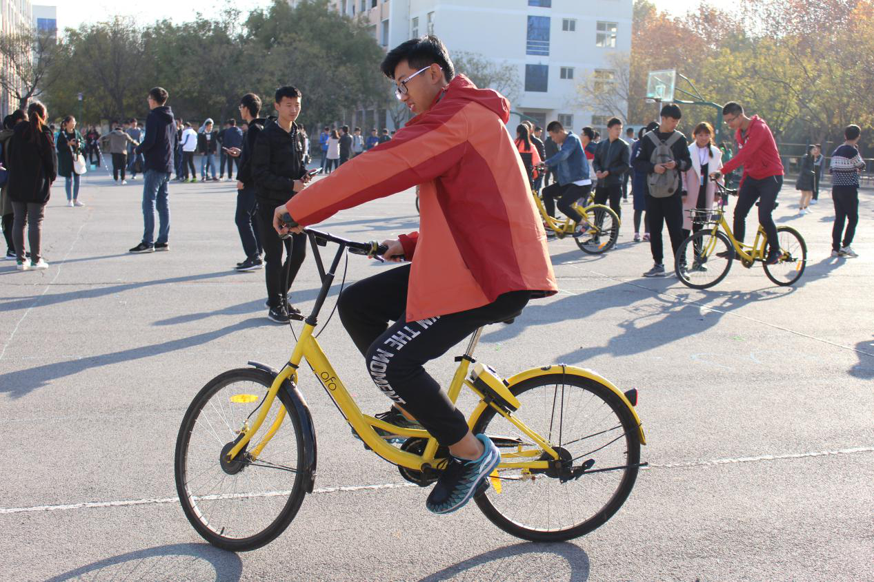 自行车慢骑中,一位同学正在努力扭动车头让自行车速度慢下来同时保持平衡。该活动最后由王洋同学拿下金牌。