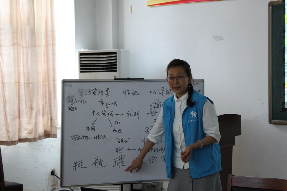 徐进老师首先对同学们积极投身实践的热情表示赞扬,并向大家讲述了本次培训的课程安排。随后,郑玲芝老师便根据自己丰富的工作经验,分别从垃圾分类、垃圾减量、垃圾降解等方面进行讲述,她号召同学们要培养“零垃圾”理念,减少日常生活垃圾,用手工制作的“壹起分”布袋代替大量使用的塑料袋。在徐进的配合下,郑玲芝向大家现场演示“波卡西”堆肥的方法以及“环保酵素”的具体操作流程,此互动环节引起了同学们的参与热情。同时,她提出“5R”原则,即:拒绝、减少、重复使用、回收、堆肥等五个原则,呼吁同学们真正地在日常生活中落实习近平总书记“绿水青山就是金山银山”的发展理念。