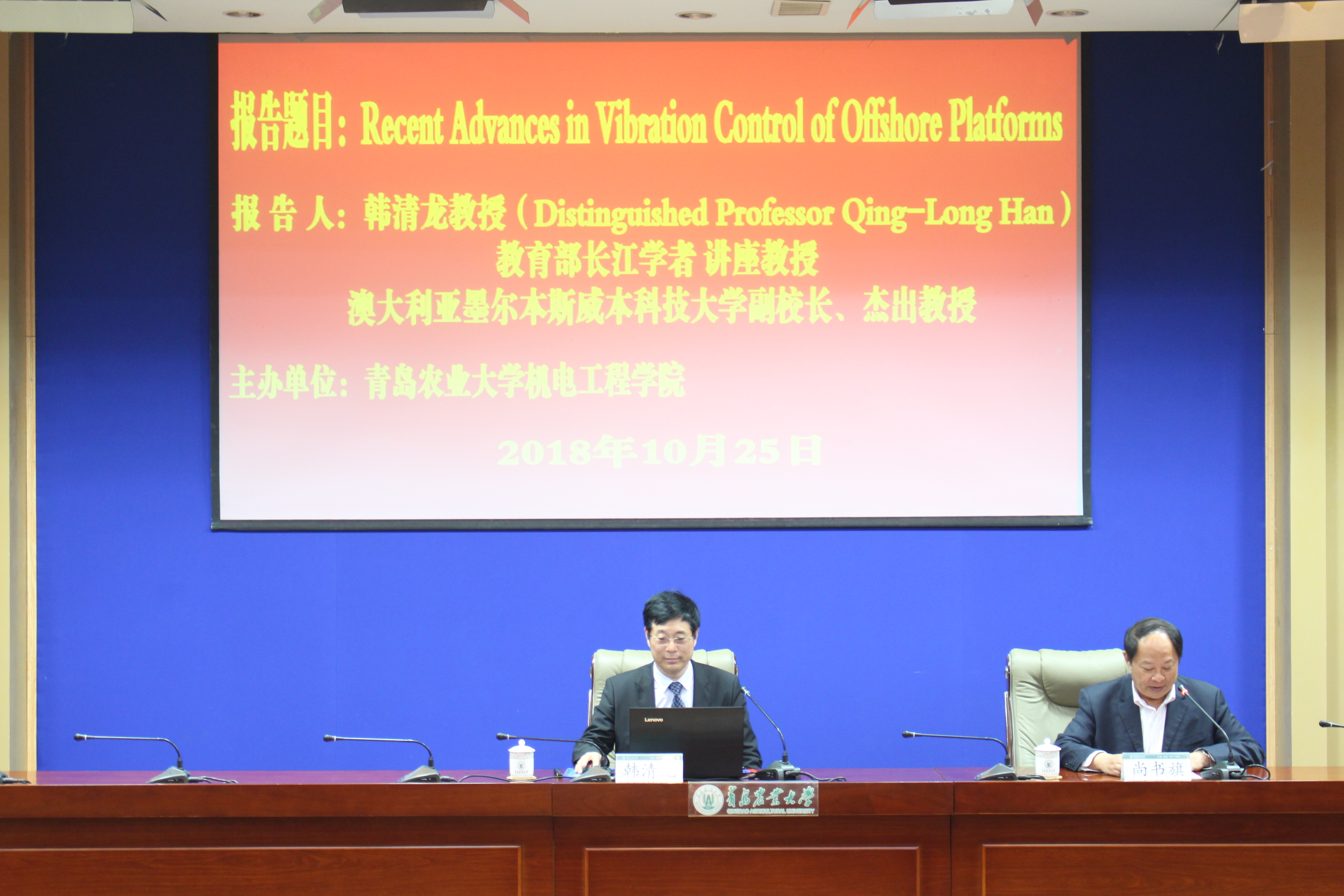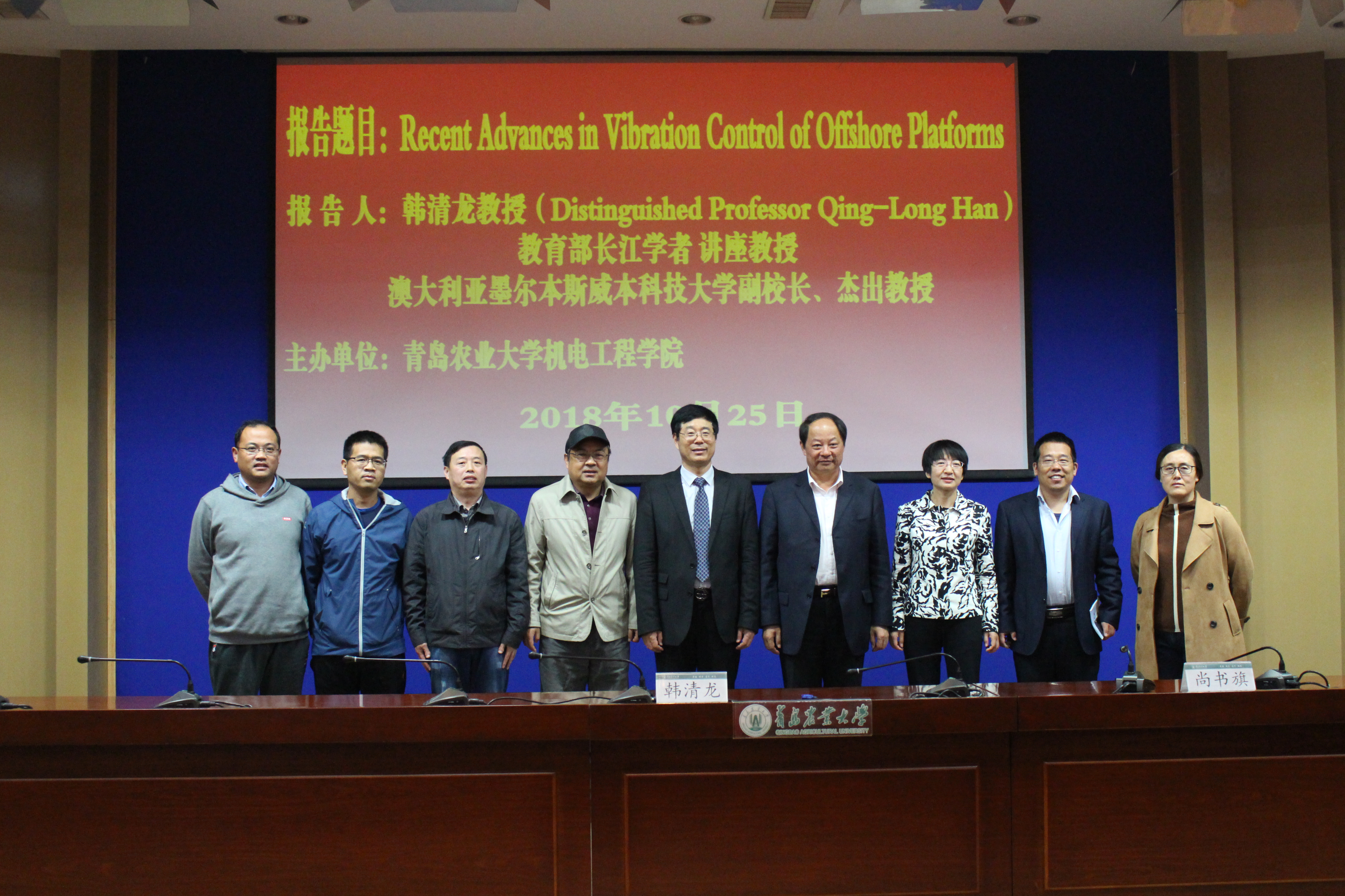 10月25日,澳大利亚墨尔本斯威本科技大学副校长、杰出教授、博士生导师韩清龙应青岛农业大学机电工程学院邀请作“海洋平台震动控制的最新进展”学术报告,学院院长尚书旗主持。