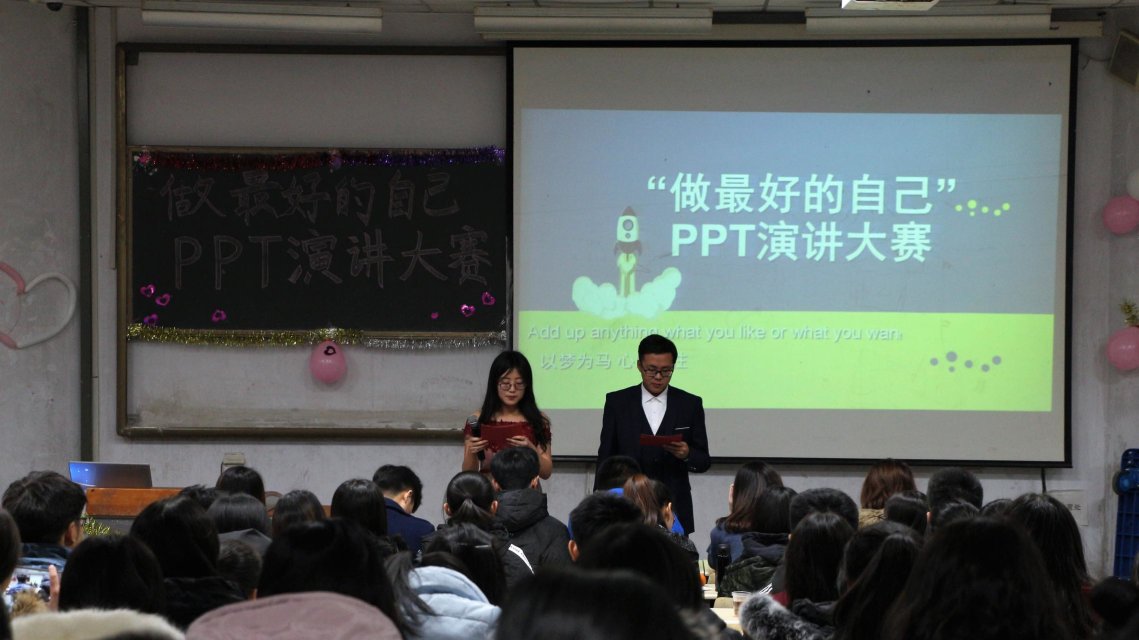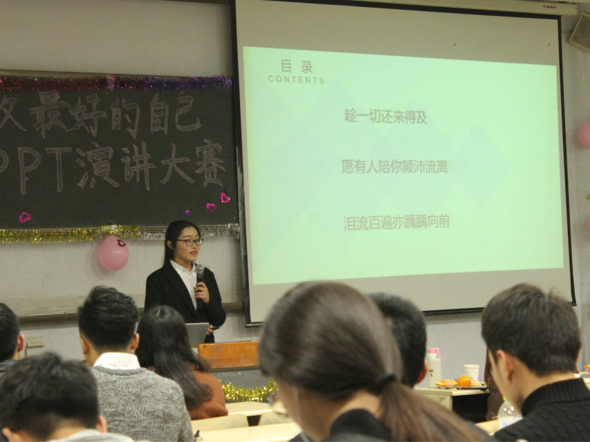12月9日星期六,由校学生会主办,动物医学院、国际教育学院、建筑工程学院、食品学院四个学院协办的ppt演讲大赛“做最好的自己”校级决赛在教学区B102举行。国教学院共有四名同学进入决赛并全部获奖。