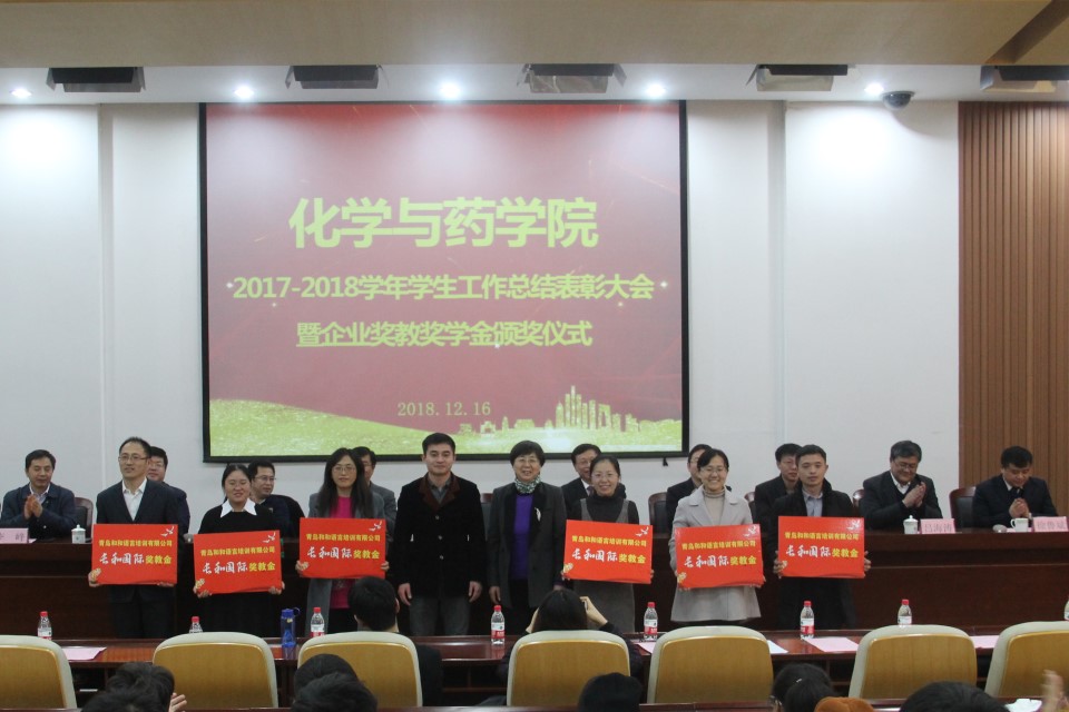 12月16日,青岛农业大学化学与药学院于学术会馆第一报告厅举行2017—2018学年学生工作总结表彰大会暨企业奖教奖学金颁发仪式。青岛农业大学校党委学工部(处)副部长王国辉、校团委副书记王光炬、青岛瀚生生物科技股份有限公司总经理褚维约、山东德州神牛药业有限公司副总经理肖建森、青岛长和国际教育咨询有限公司运营总监、校友许龙龙及学院党政领导出席会议,会议由院党委副书记史雪辉主持。