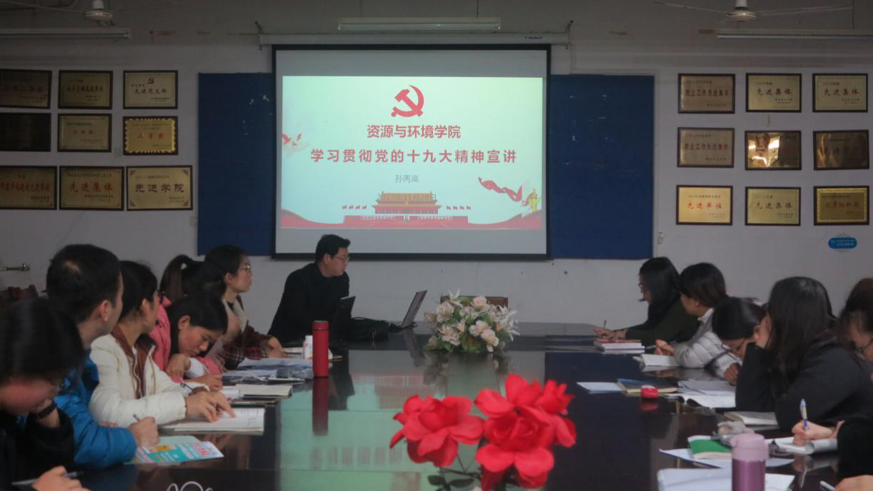 根据《中共青岛农业大学委员会关于认真学习宣传贯彻党的十九大精神的通知》,青岛农业大学资源与环境学院多层面开展党的十九大精神宣讲,让党的十九大精神在资环学院落地生根,开花结果。