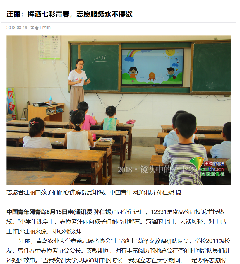 中国青年网青岛8月15日电(通讯员 孙仁妮)“同学们记住,12331是食品药品投诉举报热线。”小学生课堂上,志愿者汪丽向孩子们耐心讲解着。菏泽的七月,云淡风轻,对于已工作的汪丽来说,却心潮澎湃......