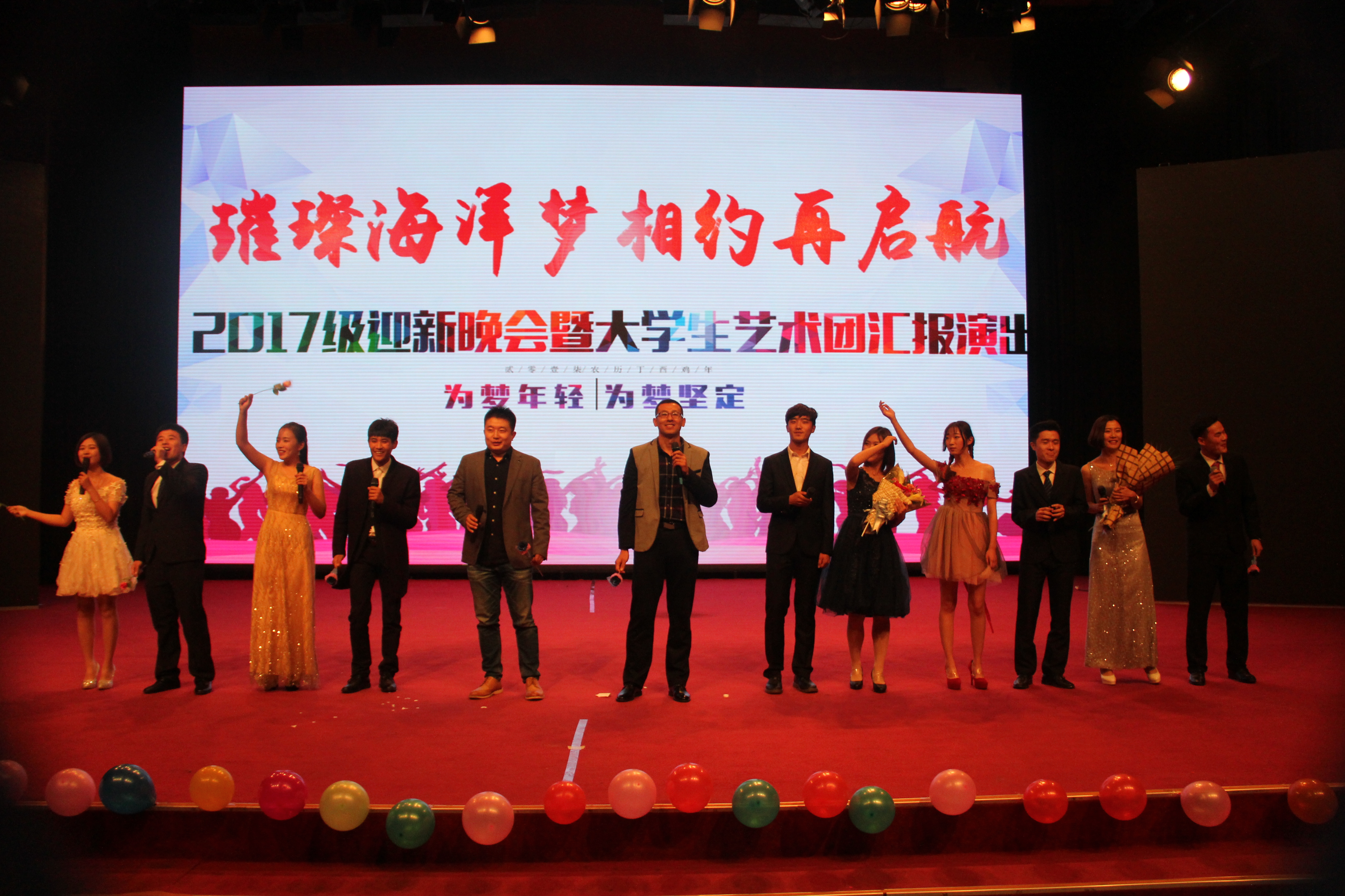 11月12日,青岛农业大学海洋科学与工程学院2017级“璀璨海洋梦,相约再起航”迎新晚会暨大学生艺术团汇报演出在文经楼演播大厅举行。海洋学院主要领导、2017级班主任与全体新生一起观看演出。