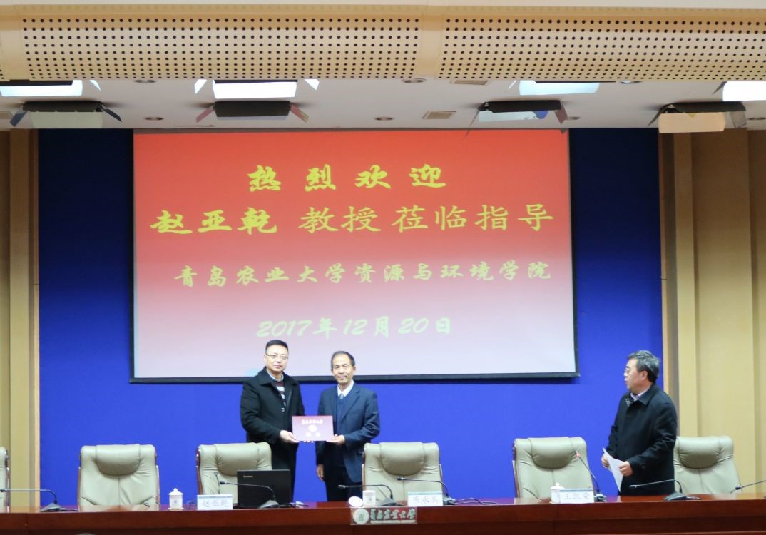 12月20日,青岛农业大学资源与环境学院于学术会馆报告厅举行赵亚乾客座教授聘任仪式。副校长原永兵向赵亚乾教授颁发客座教授聘书。
