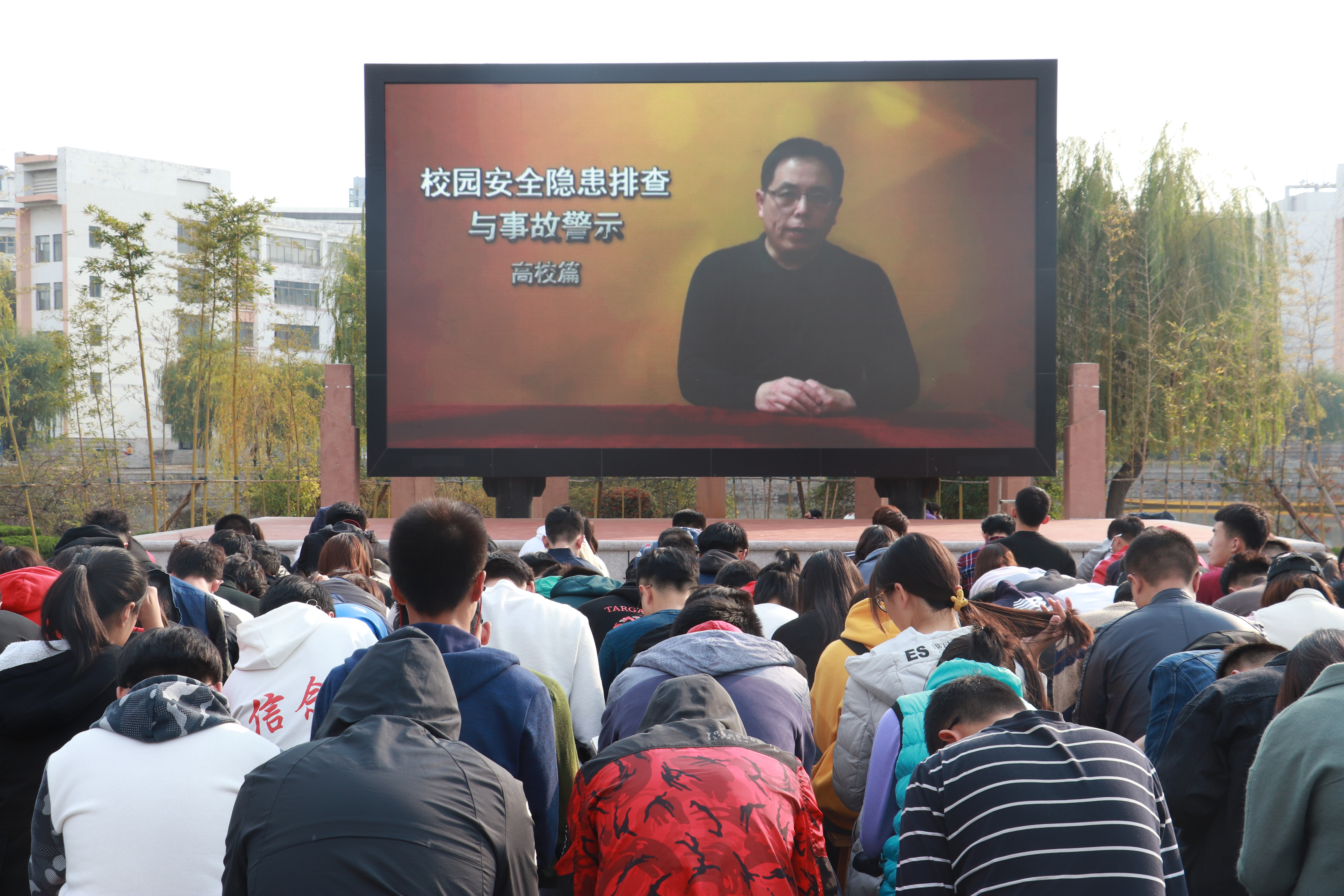 为普及安全知识,增强同学们的安全防范能力,确保安全稳定,青岛农业大学宣传部、保卫处于消防周期间在知音广场利用大屏幕联合进行消防视频循环展播。11月4日,理学与信息科学学院组织学生会主席团、生活部全体人员以及各班舍长到达现场观看《校园安全隐患排查与事故警示》安全教育片。
