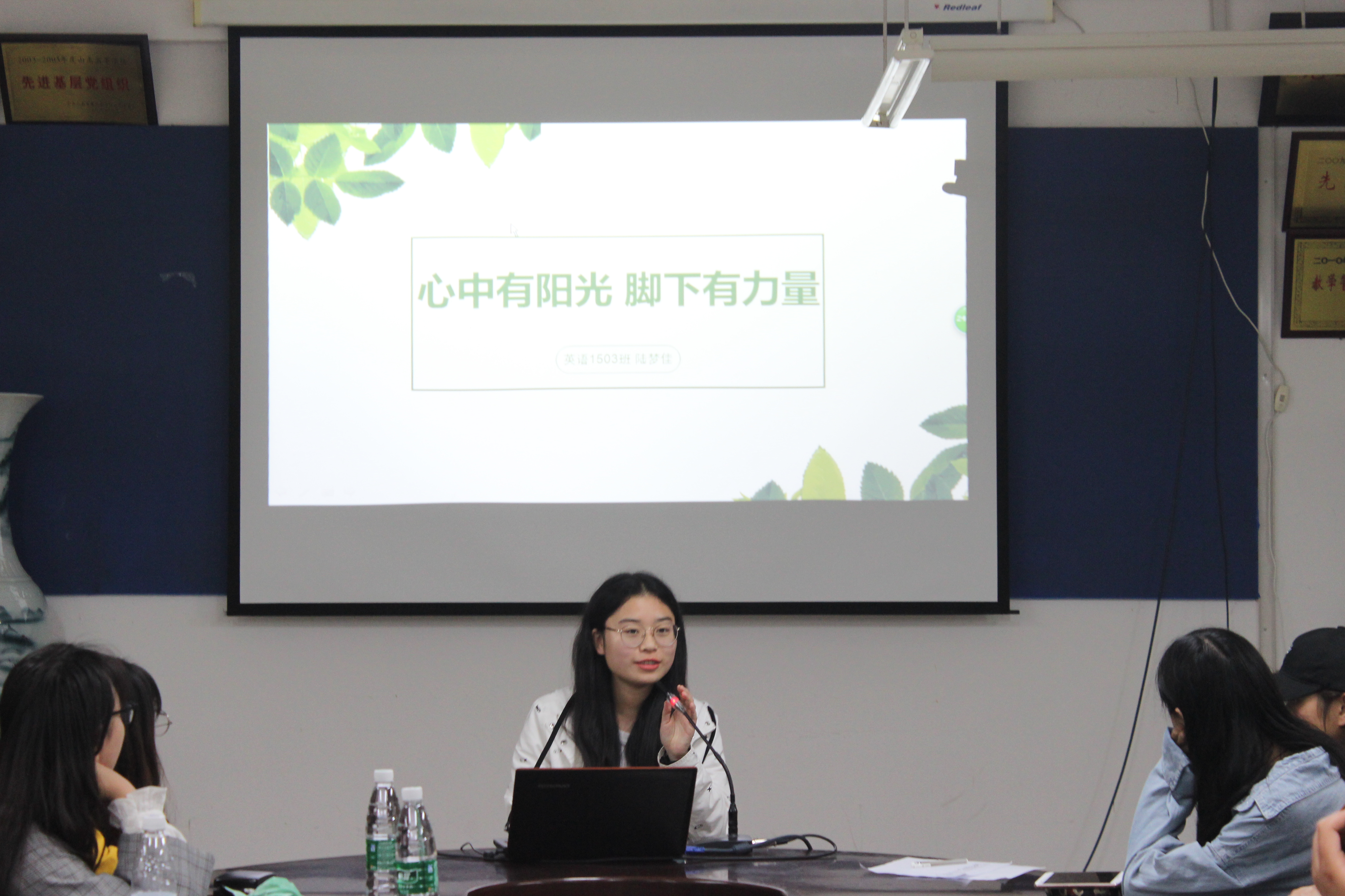 此次座谈会邀请外国语学院团委兼职副书记、国家奖学金获得者、山东省高等学校优秀学生、青岛农业大学第六届“身边的青春典型”事迹宣讲团成员陆梦佳,分享关于她的学习方法和工作经验。“心中有阳光,脚下有力量”陆梦佳以此为主题,结合上大学以来的经历,通过PPT的形式从定义自己、社团活动、志愿服务、学习经验、处理学习工作关系等方面生动全面地向大家分享了她的心得。