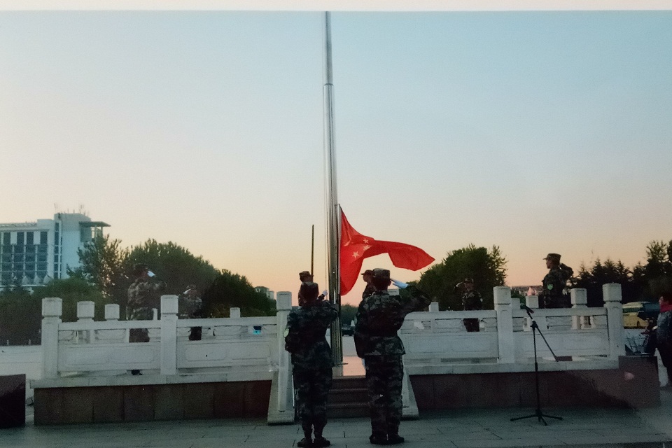 作品《致敬国旗》中记录了国护队进行国旗升降的瞬间,他们守卫着国旗,守卫着信仰。从照片中能看出作者饱含着的对祖国的敬仰与热爱。