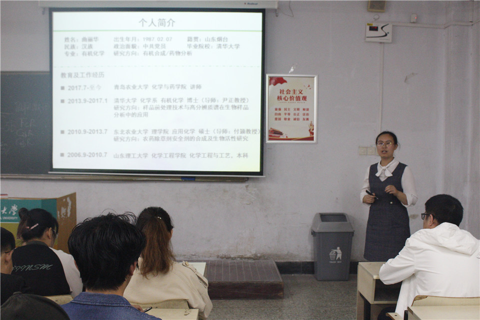 5月16日,青岛农业大学化学与药学院于教学区举行立德树人大讲堂之博士论坛。讲座由学院团委书记王海霞主持,学院学生代表参加。本期论坛的主讲人是生物制药技术与应用团队曲丽华博士、理论计算与模拟团队团队刘丙萍博士。