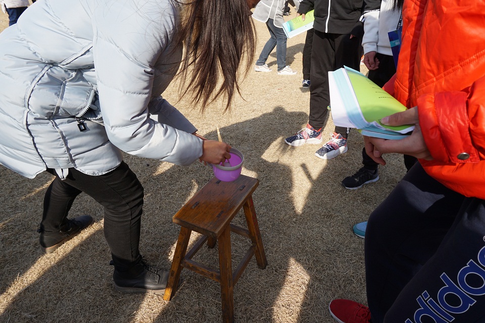 “珠行万里”,同学们带着热切的期待夹着乒乓球奔赴终点。即使同学们偶尔有失误,但现场有的只是同学们之间相互鼓励的话语。