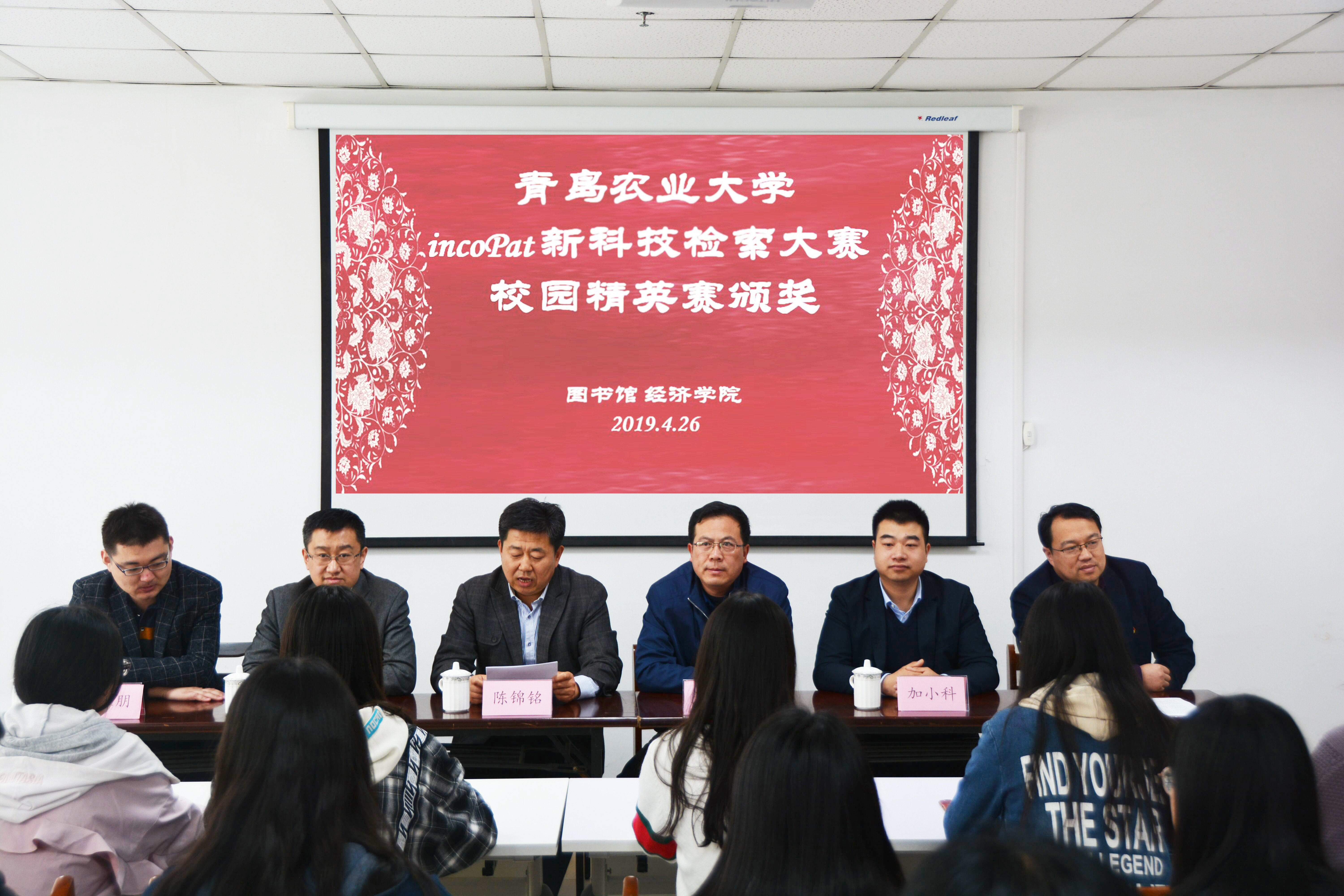 4月26日,经济学院(合作社学院)与校图书馆在主楼芝兰书室共同举行“incoPat新科技检索大赛校园精英赛”颁奖仪式。经济学院(合作社学院)党委书记陈锦铭、图书馆党总支书记王晓雷、馆长牟肖光、副馆长马启山、北京合享智慧科技有限公司山东公司总经理加小科、青岛鼎丞知识产权服务有限公司韩耀朋出席活动,老师代表和学生代表共计70余人参加活动。颁奖仪式由马启山主持。