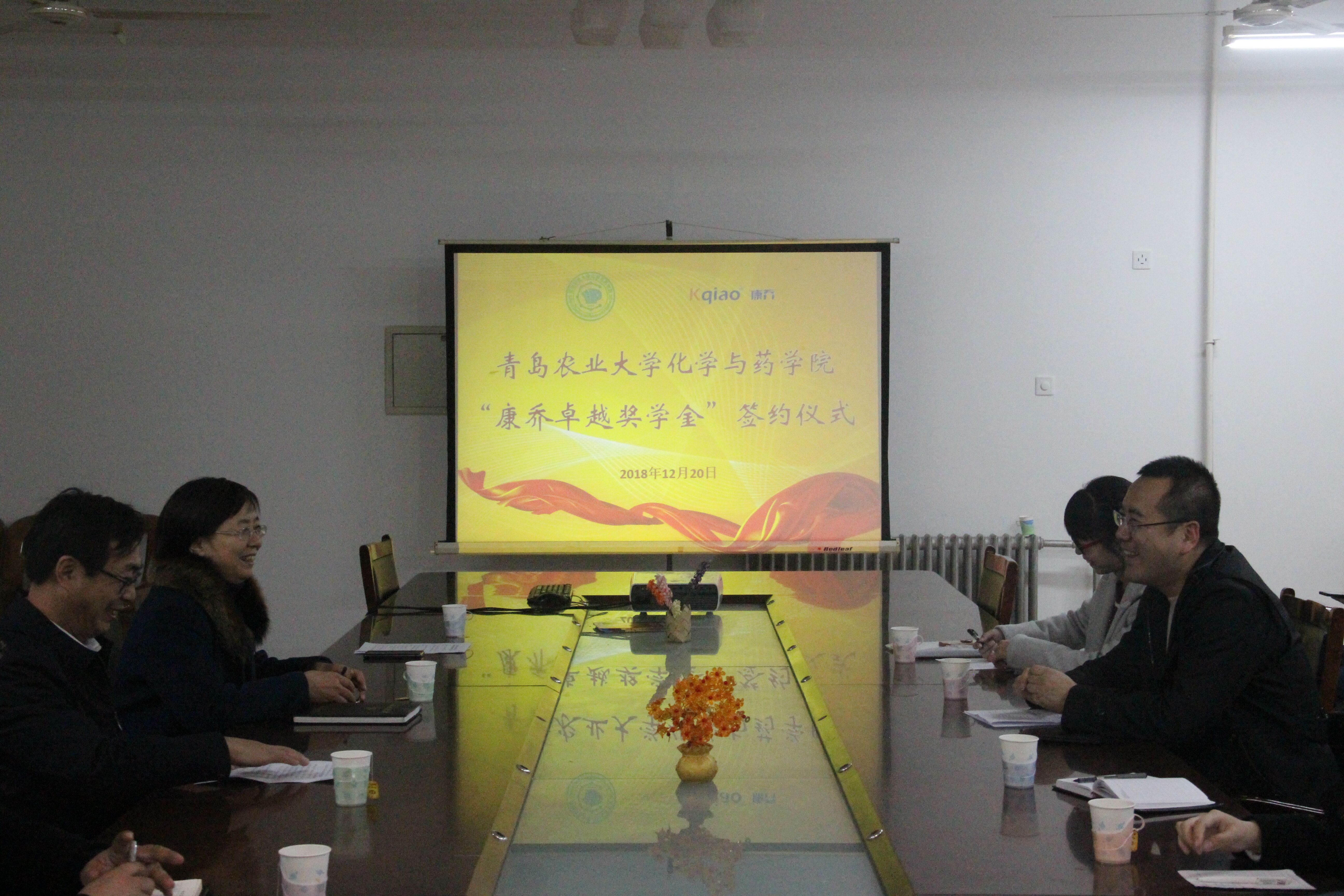 12月20日,青岛农业大学化学与药学院于学院会议室举行“康乔卓越奖学金”捐赠签约仪式。校党政办公室主任、校友总会副秘书长赵奎皓,山东康乔生物科技有限公司联合创始人、董事、副总经理、果树保护专业97级祝青波等校友,校党政办公室主任科员于宁,学院党委书记梁安波等党政领导出席仪式。学院党委副书记史雪辉主持仪式,师生代表参加。