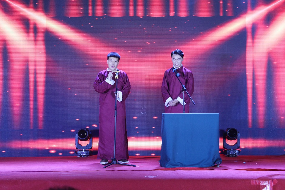 水养1403王帅、李培伟为毕业生们带来幽默又具有启发意义的哑剧《攀比》,海院曲艺队也精心准备了笑料十足的相声,掀起了晚会的高潮。