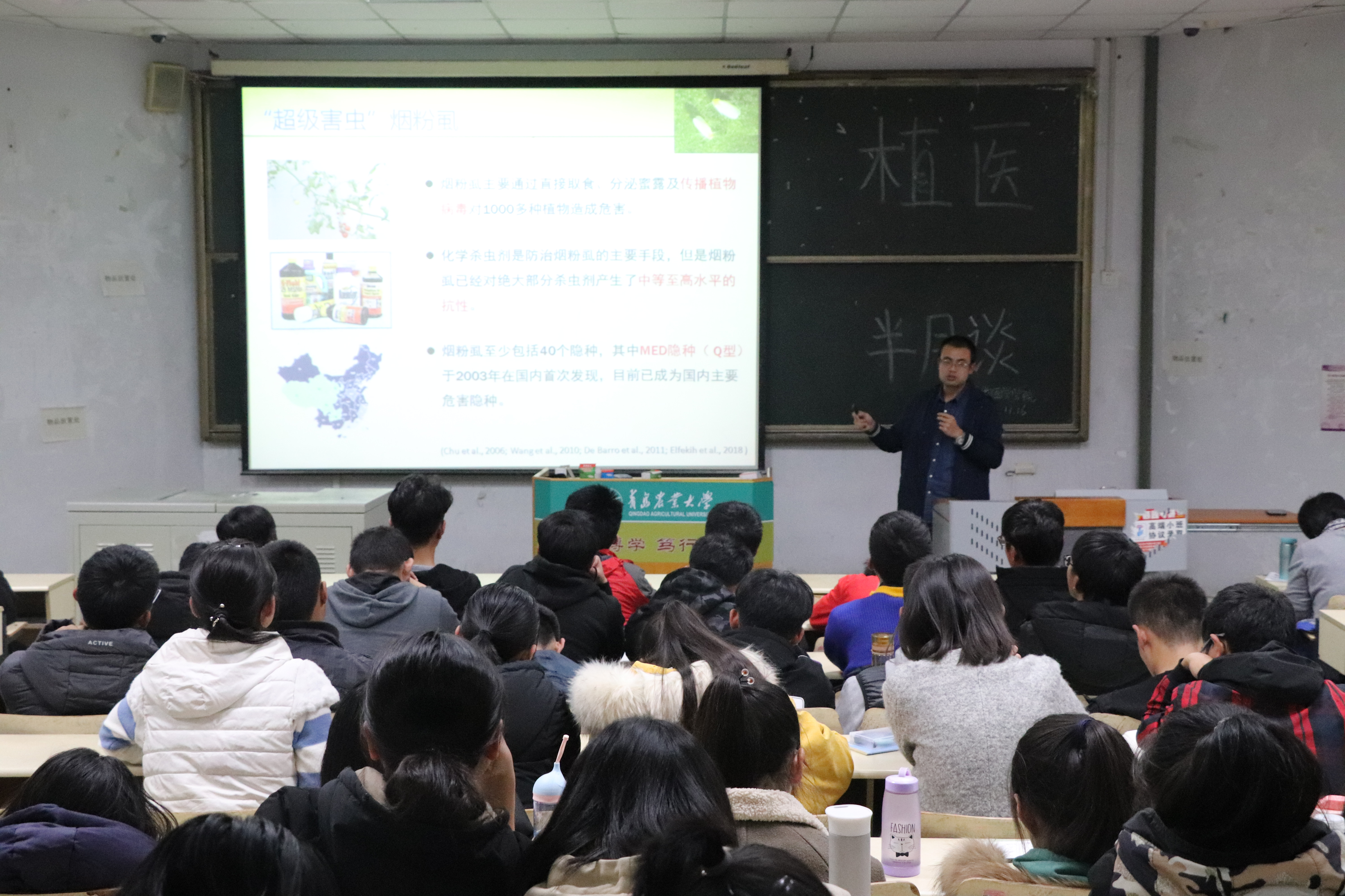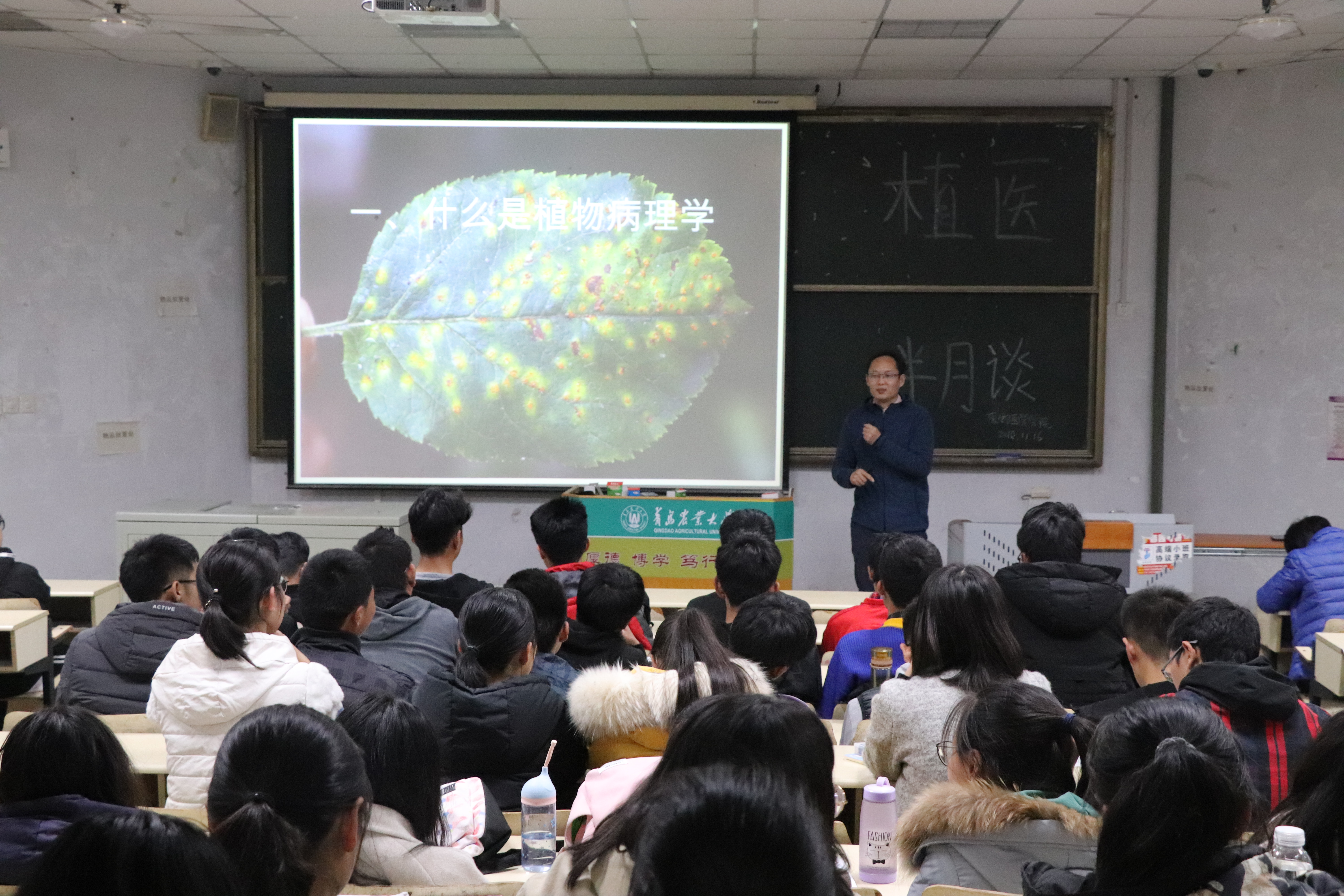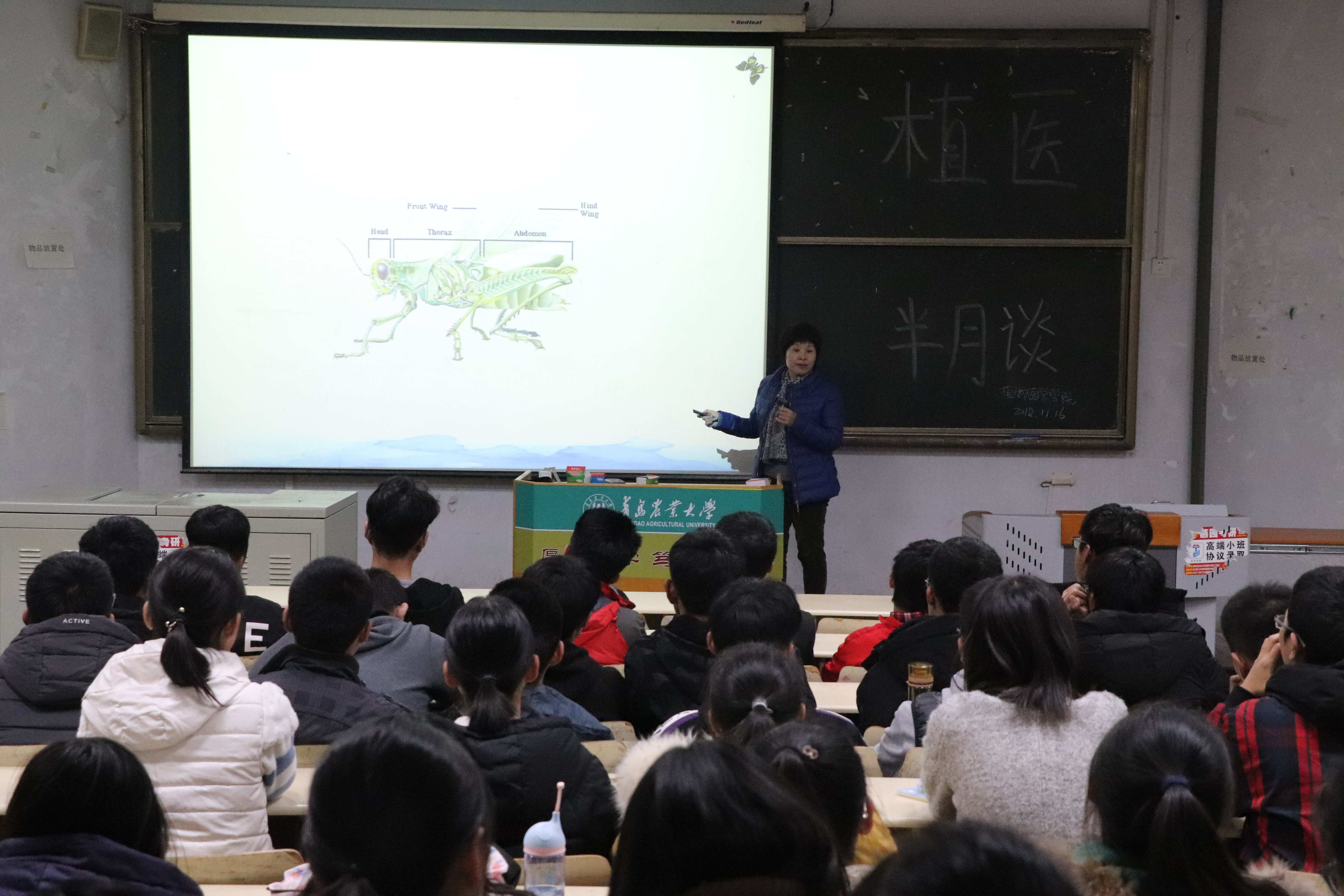 11月16日,青岛农业大学植物医学学院“植医半月谈”第三讲于教学楼开讲,学院昆虫系郑桂玲老师,病理系练森老师,农药系郭磊老师参与活动,2018级全体同学参加。