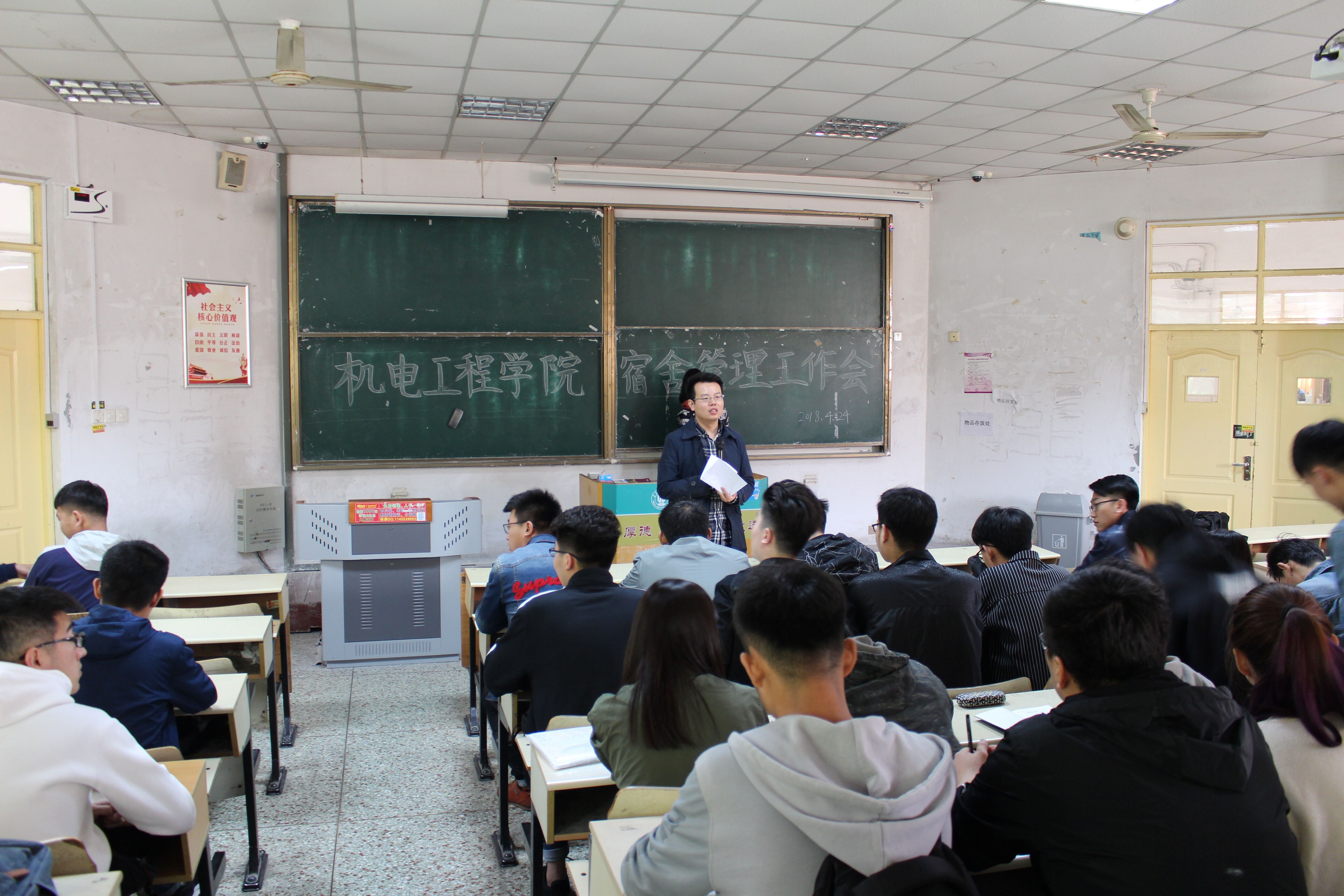 机电工程学院于4月24日召开宿舍管理工作会议,正科级辅导员安金鹏反馈了学院大一到大四学生宿舍卫生检查情况并提出了工作要求。学生会各部门部长,17级班主任助理和各班班长参加了会议。