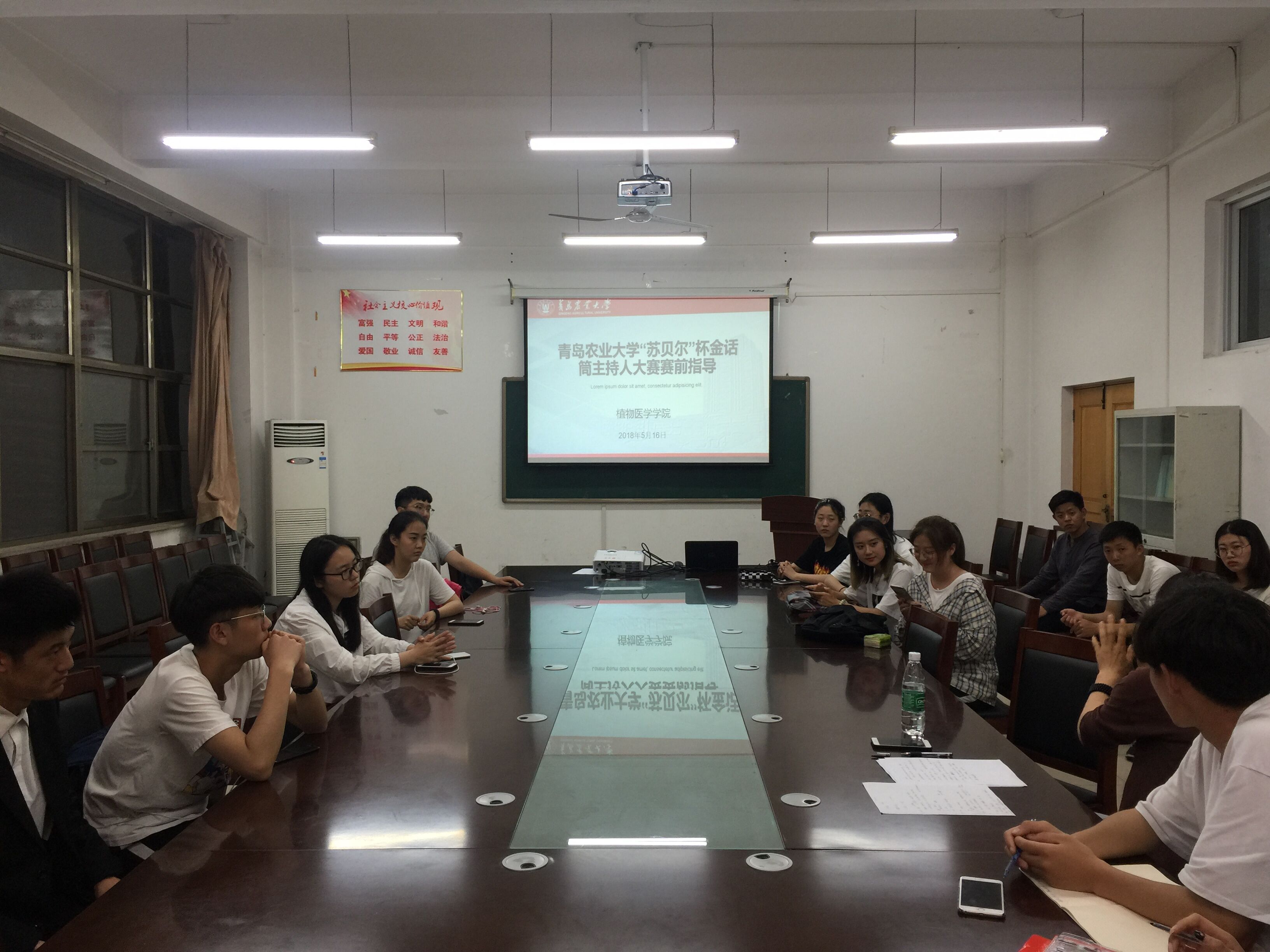 5月16日,由青岛农业大学校团委主办、植物医学学院分团委承办的第十二届科技文化艺术节“苏贝尔”杯金话筒主持人大赛决赛赛前培训在生物楼C103举行,动漫与传媒学院邵丽英老师、植物医学学院团委书记马伟萍出席培训会。
