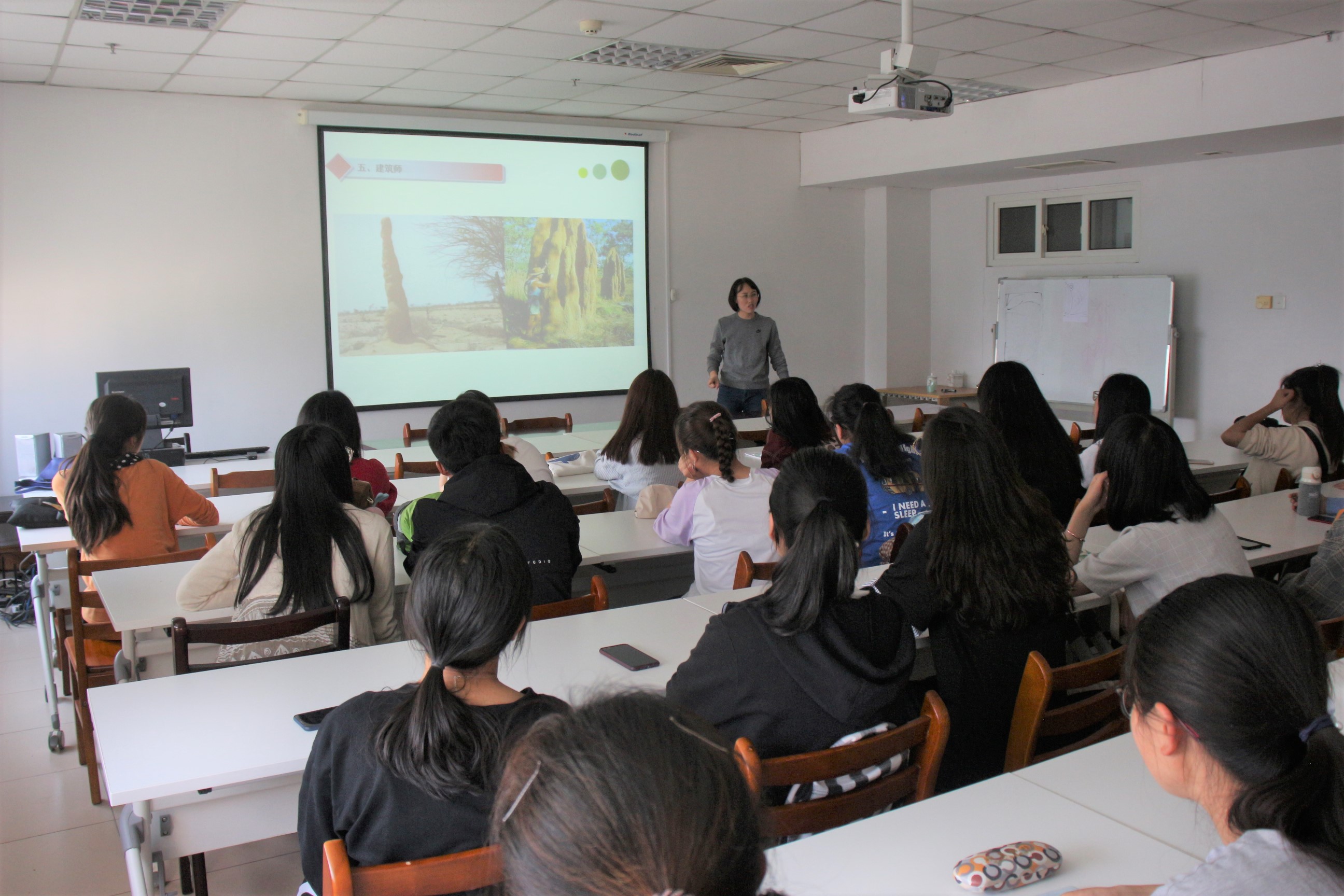 李洁以“美丽与智慧并存的生物——昆虫”为主题,结合自身广泛阅读各类专业书籍的经验,给大家带来了一节趣味知识小课堂,课堂上,她给同学们介绍了一些有趣的昆虫种类,和它们特有的现象、行为,这些知识引起了同学们的极大兴趣,在场同学反映热烈,积极与老师互动问答。