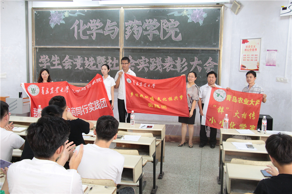 7月7日,青岛农业大学化学与药学院于教学区举办2017年暑期社会实践表彰大会暨2018年暑期社会实践出征仪式,此次活动由院社会实践部部长周雪梅主持,学院党委副书记史雪辉、团委书记王海霞、正科级辅导员杨冬冬与2018年暑期社会实践队全体成员参加。