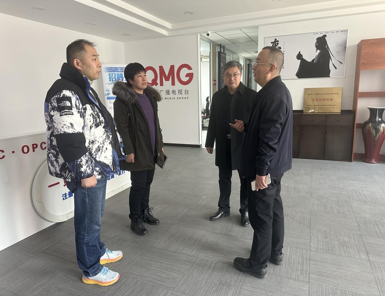 学院一行首先抵达青岛广电传媒电子商务有限公司,公司总经理马永臣热情接待走访团队,并陪同开展座谈交流。该企业依托青岛广电优质官方媒体资源,紧跟数字经济与媒体融合发展浪潮,重点布局AIGC应用、AI短剧创作等新兴业务板块,是区域内深耕传媒数字化转型的标杆企业,与学院影视专业发展方向高度契合。