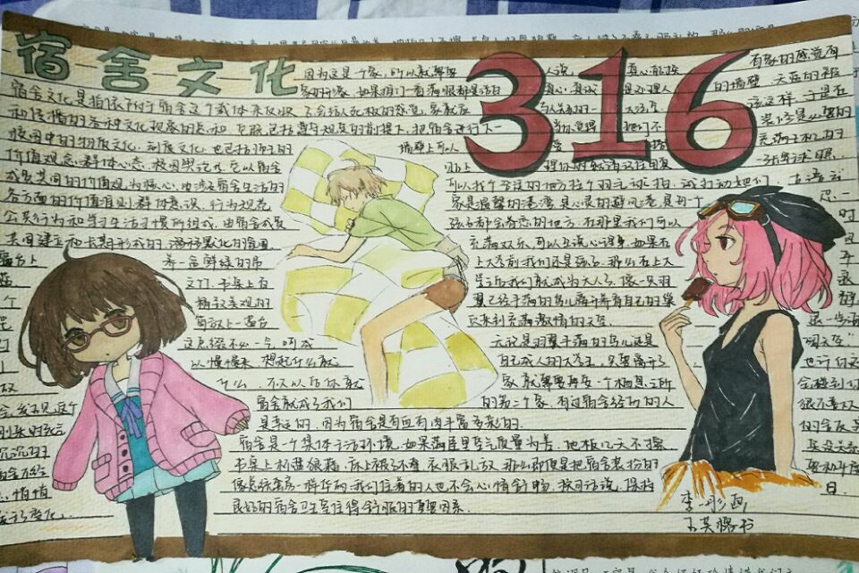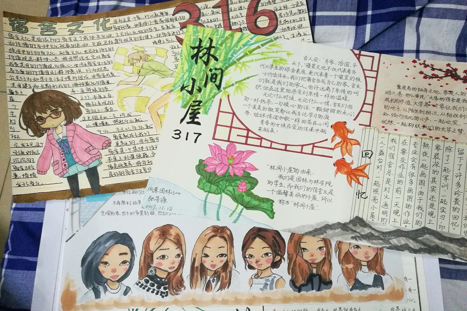 活动开始于11月上旬,历时两周,共收集40余幅作品。活动旨在维持宿舍良好秩序,丰富宿舍文化生活,提高我院学生文明素质,促使同学们养成良好的生活习惯。活动中,寝室成员集体行动、分工明确、团结合作, 将自己的思想和情感注入作品,绘制出特色宿舍风采手抄报。其中,东苑12号楼 317宿舍作品“林间小屋”凭借整洁文雅的版面脱颖而出,东苑12号楼316宿舍则凭借宿舍六人各具特色的卡通头像成为优秀作品之一。