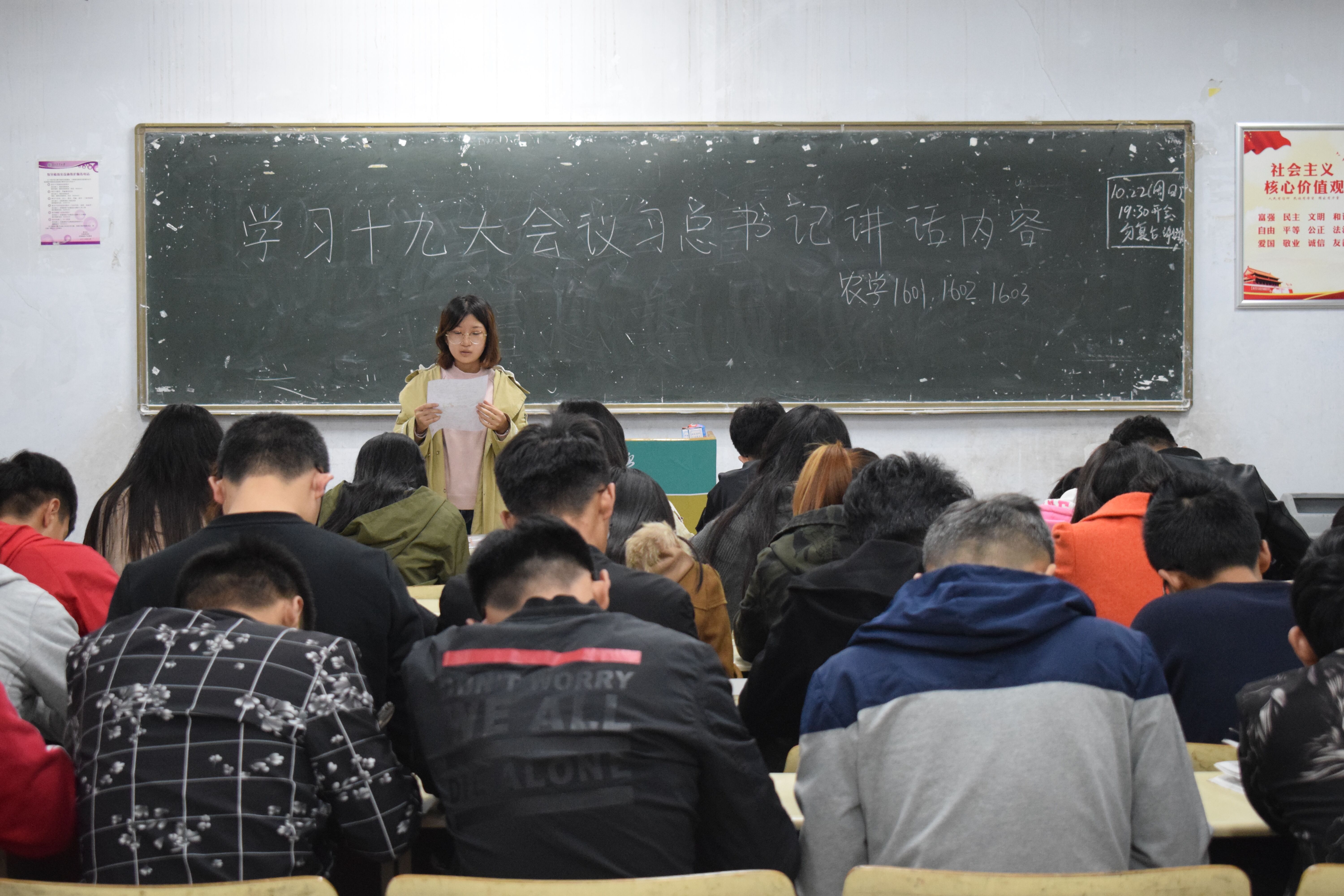 10月22日,农学院开展“学习习总书记十九大报告”的主题政治学习活动,2016、2017级全体同学积极参加。通过主题政治学习,使广大同学进一步加深对十九大精神的理解,有力提升了当代大学生的使命感和责任感。