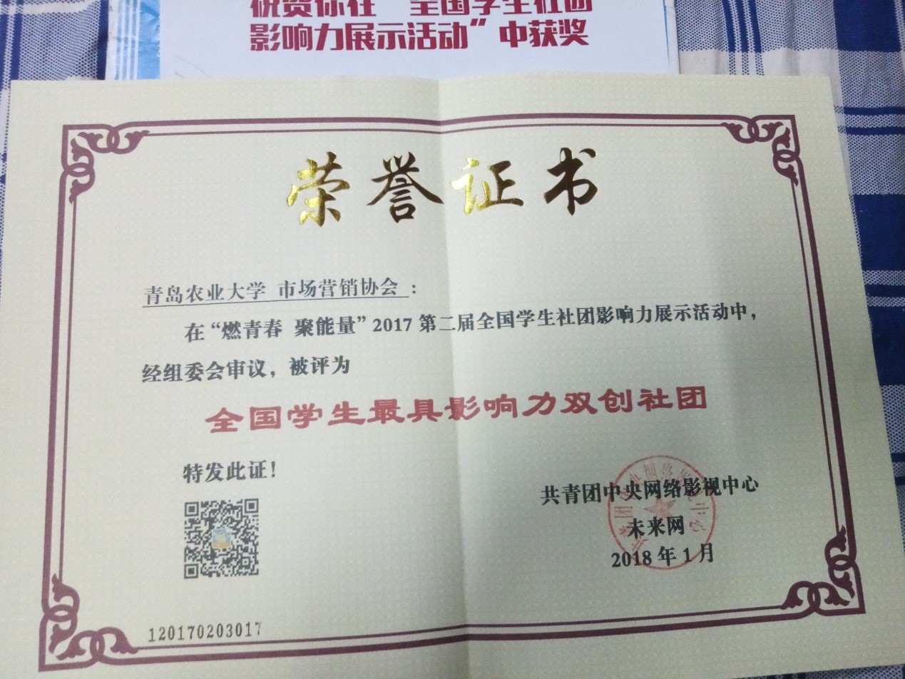 近日,“燃青春,聚能量”2017第二届全国学生社团影响力展示活动完美落下帷幕,青岛农业大学管理学院指导的市场营销协会在此次活动中荣获“大学组:全国学生最具影响力双创社团”奖项。