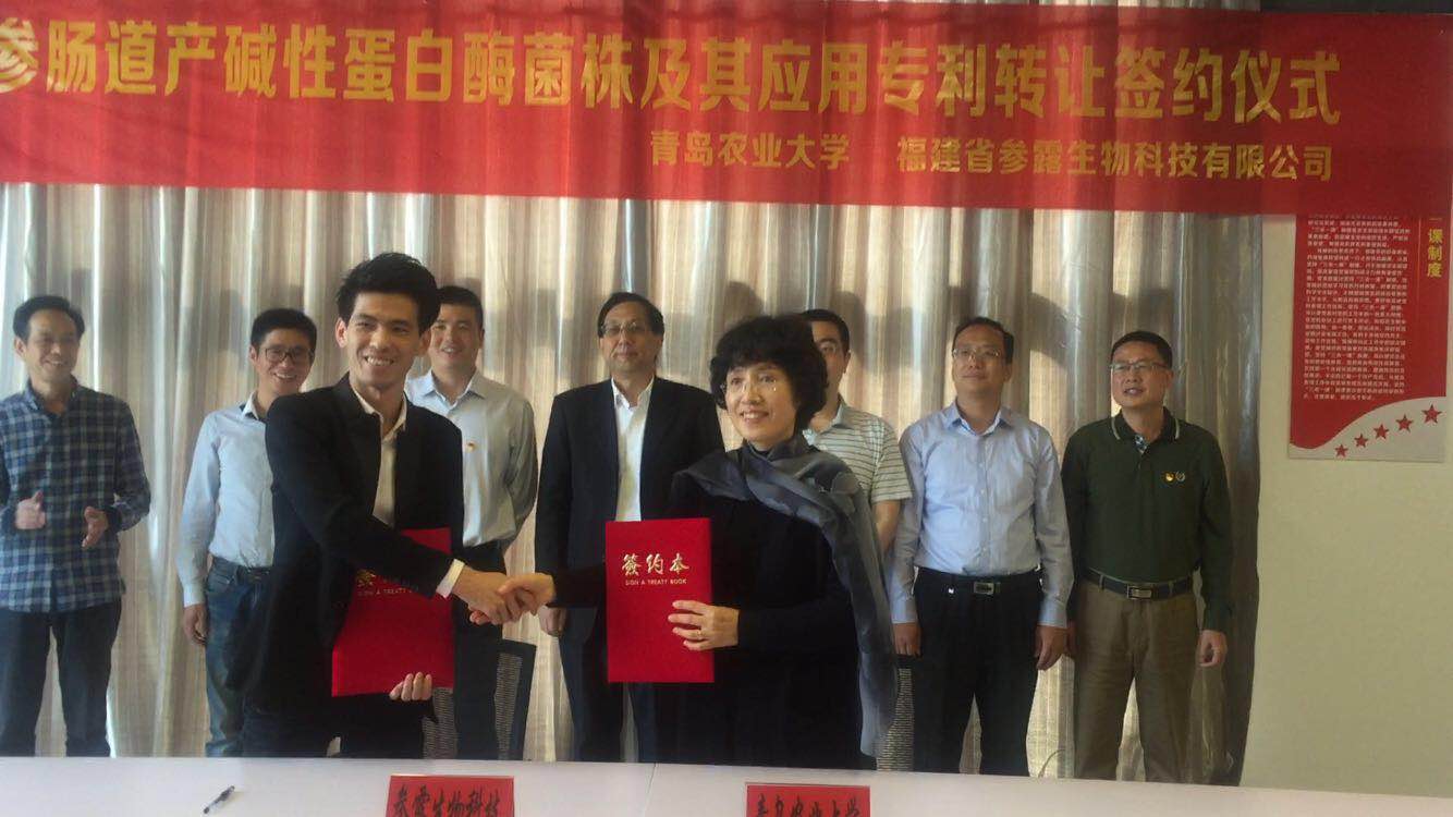 2017年11月4日,青岛农大与福建参露生物科技有限公司校企合作签约仪式在福建省霞浦县举行,食品学院朴美子教授团队“海参肠道产碱性蛋白酶菌株及其应用”发明专利成功转让。食品学院院长王宝维、科技处副处长赵龙刚出席签约仪式。福建霞浦县县委、环保局、科技局、国税局、海洋与渔业局、人社局、海参协会、三菜办等各部门负责人共同参加了签约仪式。