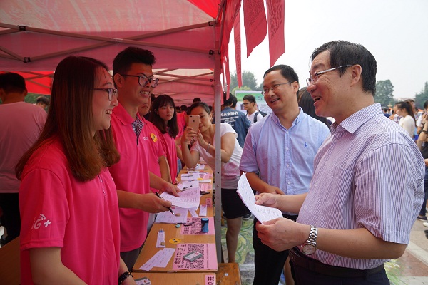 在迎新现场,校长宋希云详细了解了学院迎新工作的进展情况,并强调了做好迎新工作的重要性。在现场工作人员的介绍下,宋校长对学院建立新生家长微信群这一创新性做法十分赞许,并列举其他高校召开新生家长会的做法说明家校联系的重要性。他叮嘱班助同学要做好新生安全教育,帮助新生尽快适应大学生活。