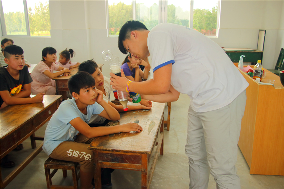 每日下午,是主题活动时间,志愿者凭借自己的学科优势,带领孩子们体验主题活动的魅力,化学主题活动中,队员们引导孩子动手操作“水的净化”、“水果电池”等实验,简单易得的材料道具,丰富多样的反应现象,紧紧吸引了孩子们的视线,让孩子们在欢笑中体悟化学奥秘,在动手间获得锻炼成长。